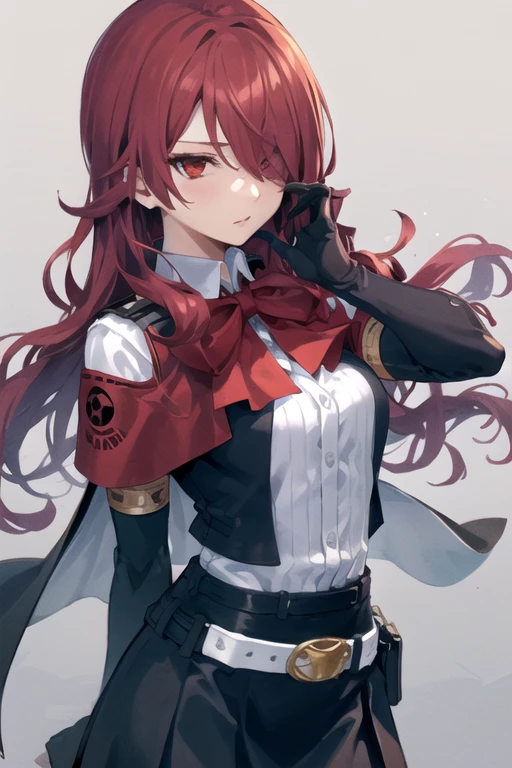 MitsuruKirijoP3R, 1girl, solo, long hair, skirt, shirt, red eyes, black gloves, hair between eyes, black vest, white shirt, red hair, pleated skirt, elbow gloves, collared shirt, belt, miniskirt, red bowtie, black skirt, capelet, hair over one eye, wing collar, armband, gekkoukan high school uniform, kirijou mitsuru