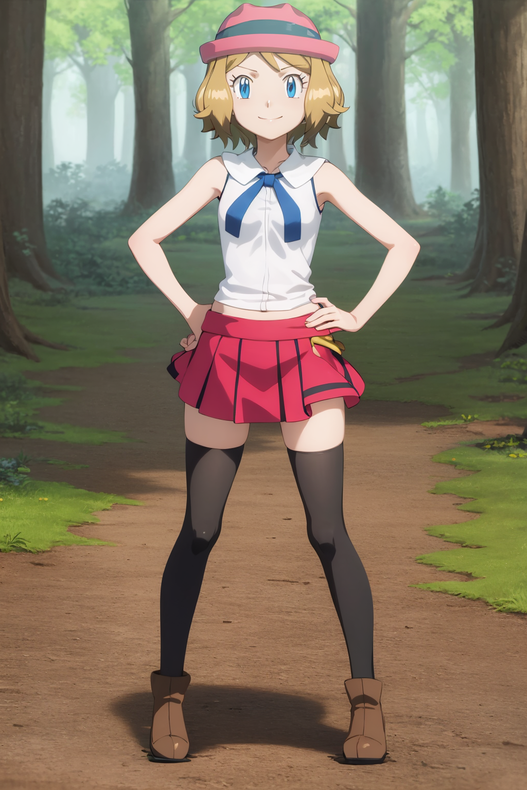 Other outfit prompts : hat, blue neck ribbon, shirt, skirt, sleeveless, thighhighs, brown footwear