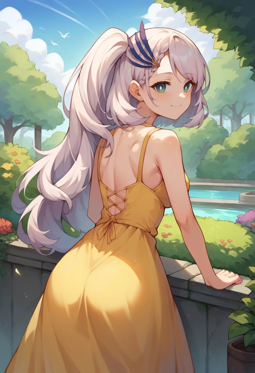 PavoliaReine, bright pupils, long hair, side ponytail, feather hair ornament