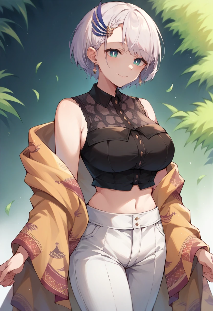 ReineCasual, bright pupils, short hair, feather hair ornament, earrings, black shirt, sleeveless, midriff, white pants, shawl