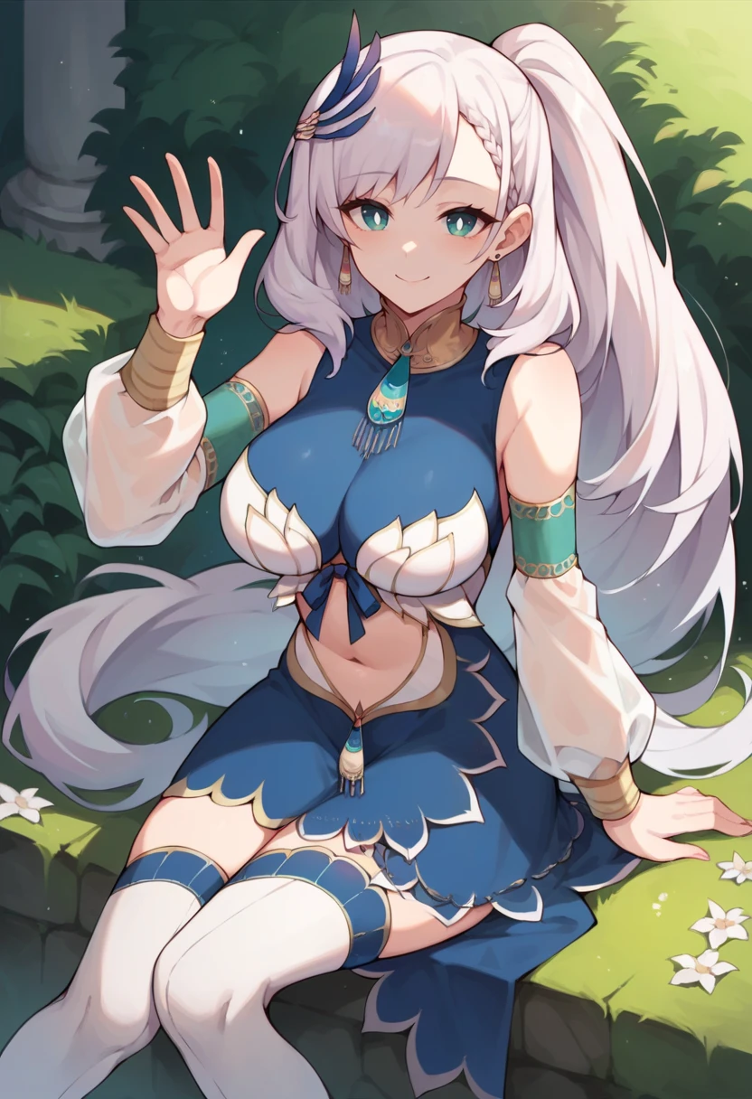 ReineBase, bright pupils, long hair, side ponytail, feather hair ornament, earrings, blue dress, navel cutout, detached sleeves, white thighhighs