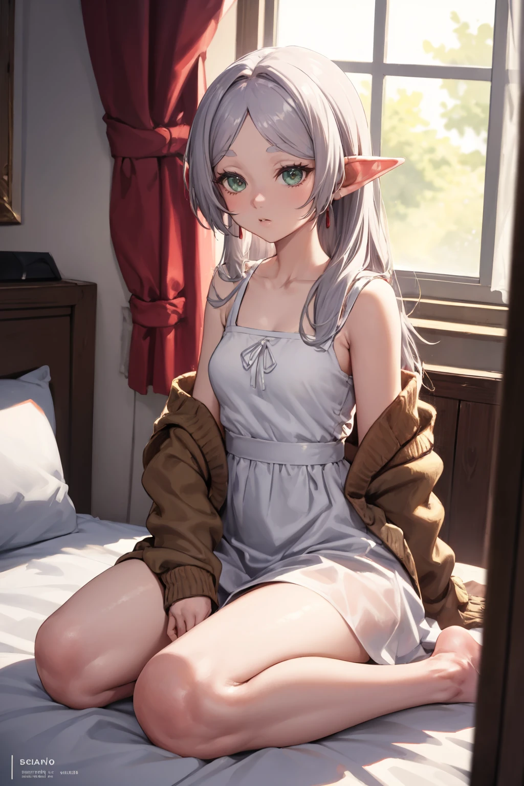 FrierenSleepwear, long hair, messy hair, white dress, sleeveless dress, brown cardiganDance Dress: