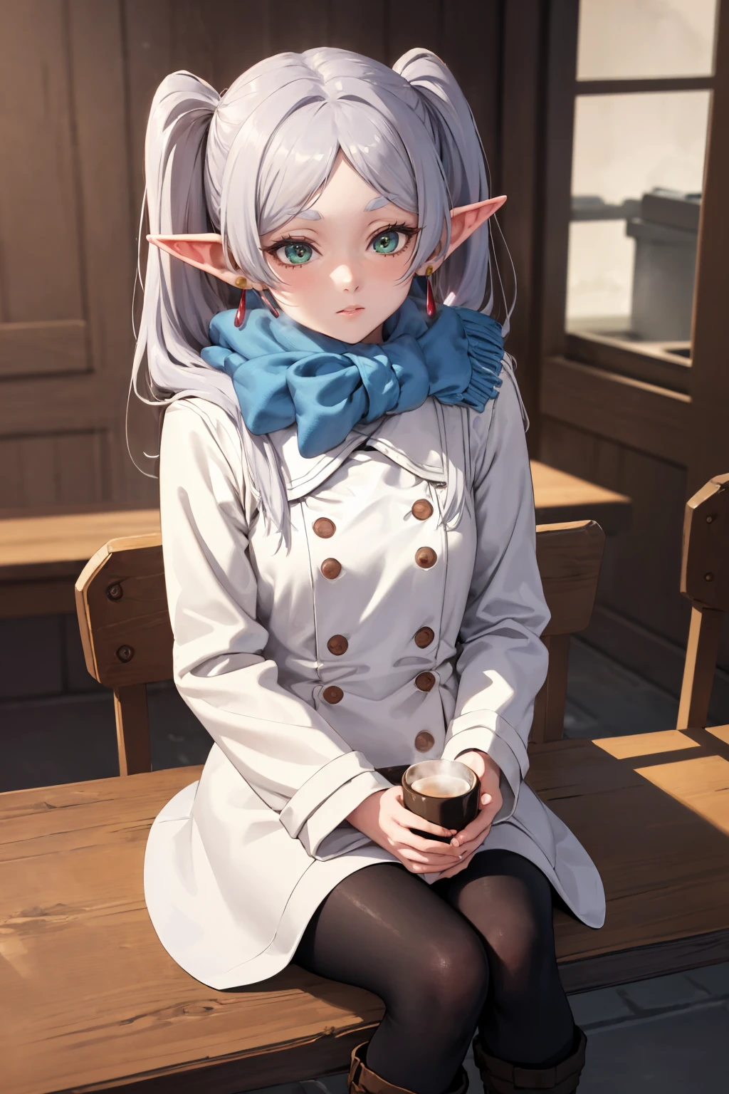 FrierenWinter, long hair, twintails, earrings, blue scarf, white coat, black pantyhose, brown bootsWinter Outfit: