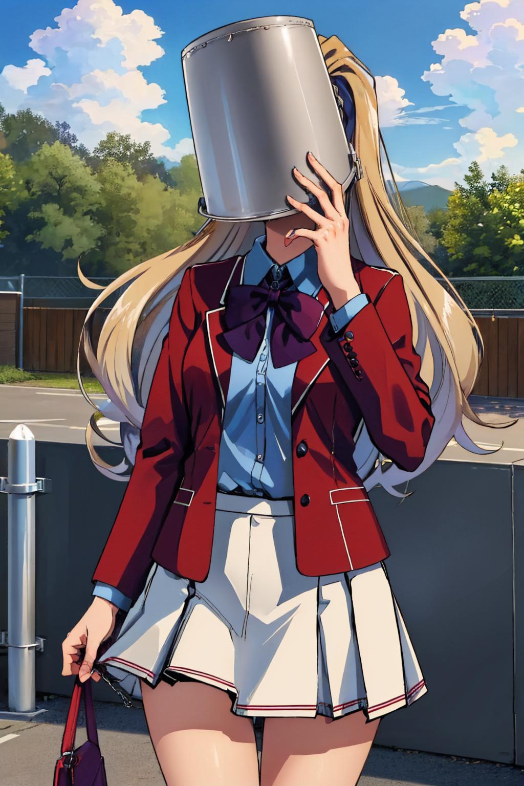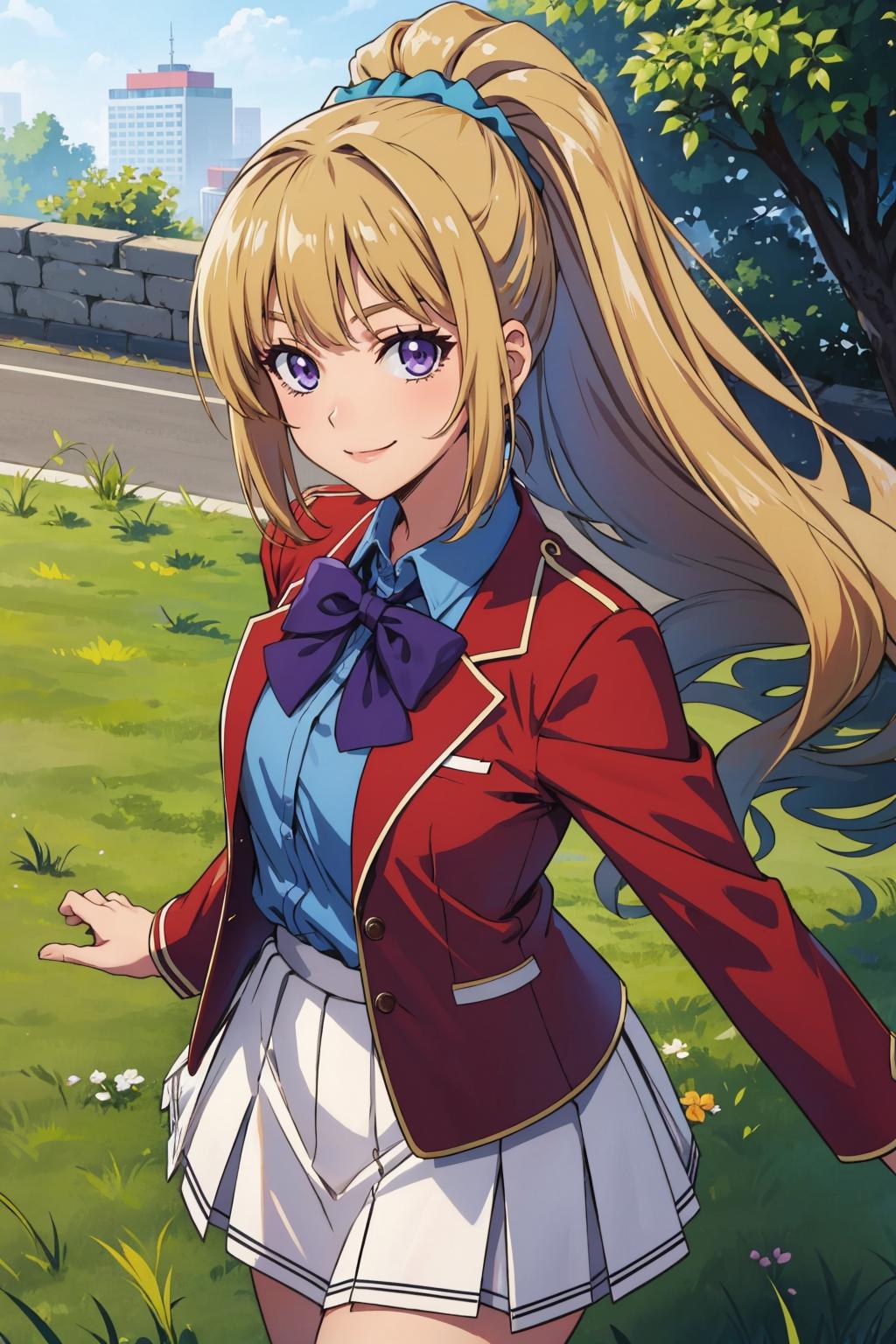 "KaruizawaBase, hair scrunchie, school uniform, blue shirt, bowtie, white skirt, red jacket, open jacket"