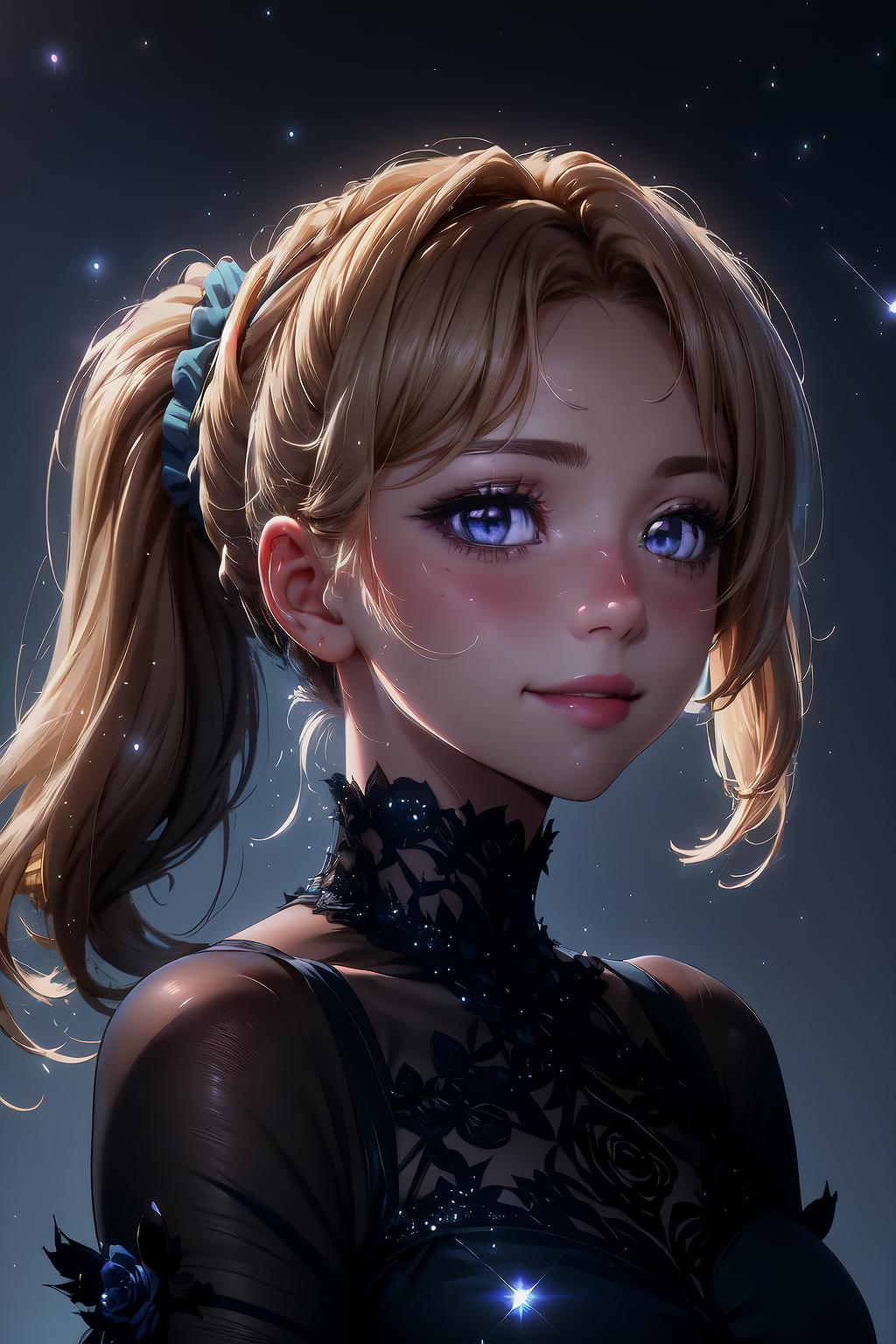 Use "hair scrunchie, ponytail" for her hairstyle.