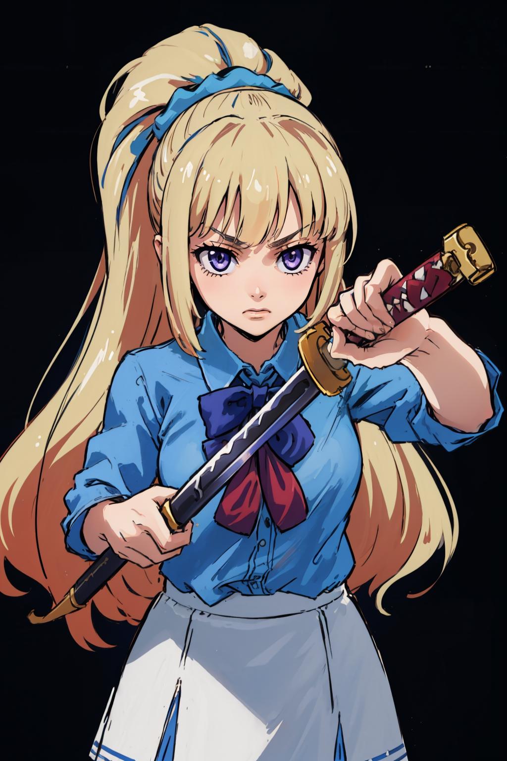 "KaruizawaBase, hair scrunchie, school uniform, blue shirt, bowtie, white skirt"