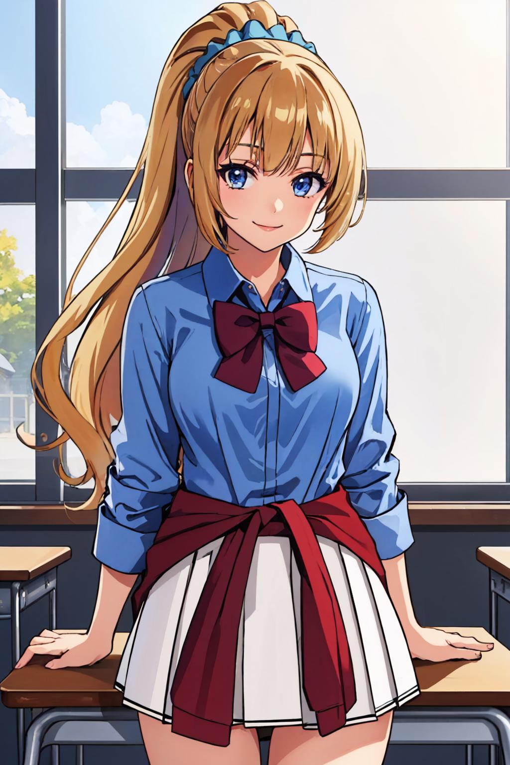 "KaruizawaBase, hair scrunchie, school uniform, blue shirt, bowtie, white skirt, clothes around waist"