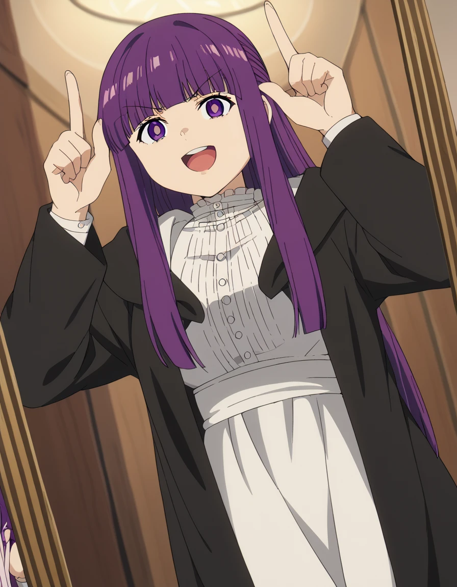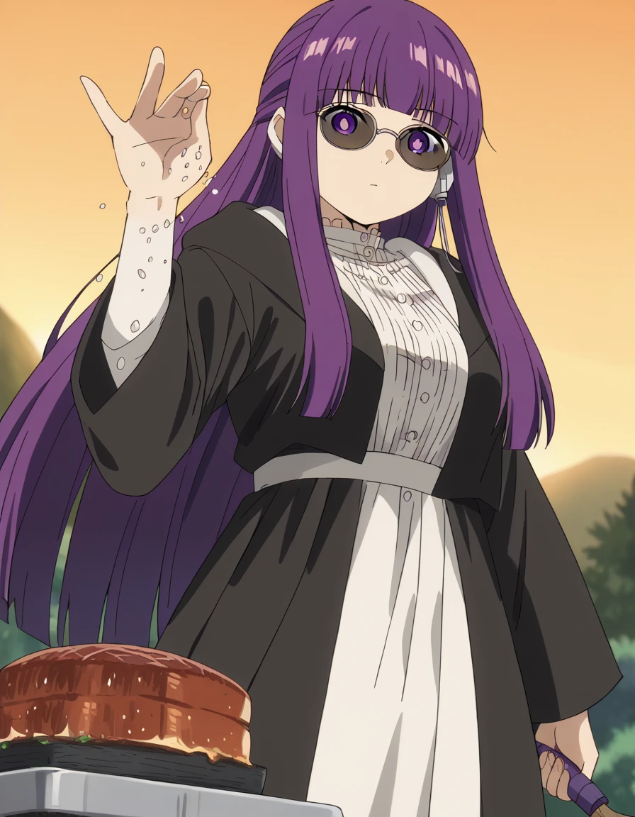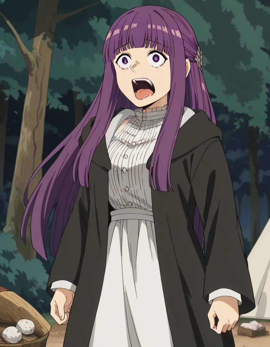 fern, long hair, bangs, purple eyes, purple hair, sidelocks, blunt bangs, bright pupils, half updo, large breasts, anime screencap