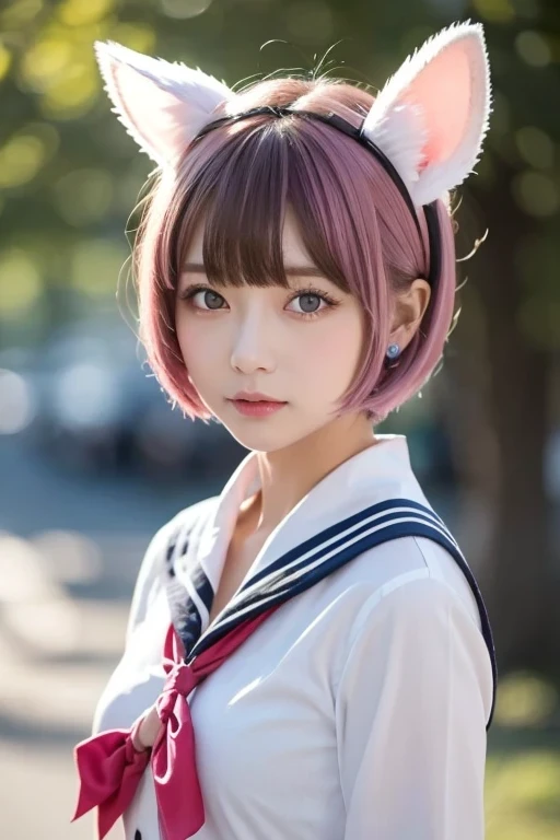faceup,ski style, One Girl , Alone, pink hair, animal ears , blue eyes, Wings, looking , bangs, short hair, bow, sailor color , white sailor color , hair bow, pink bow, Closed Her Mouth , shirt, white shirt, bear ears, bob cut, Mini Wing, portrait, detach wings , compensate, upper body, Background city