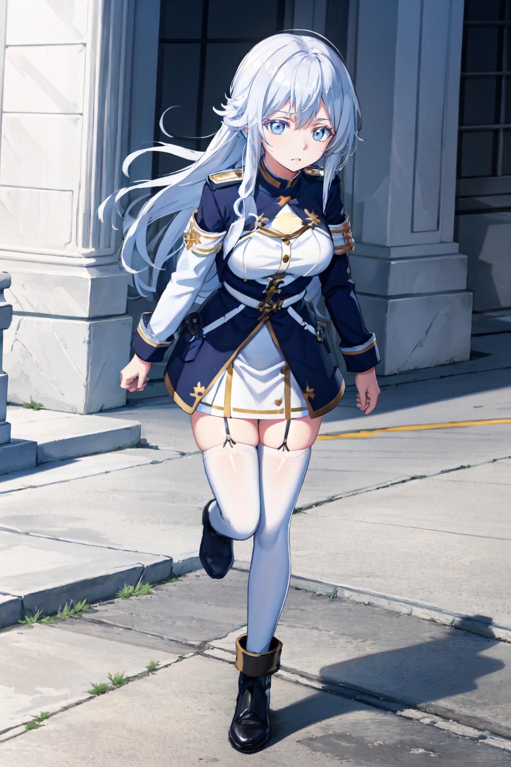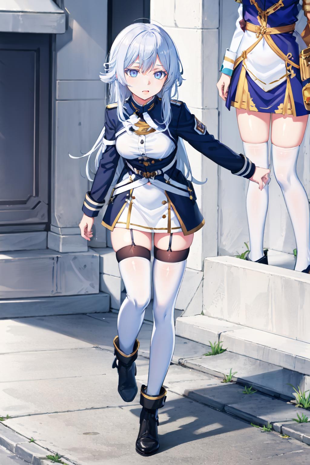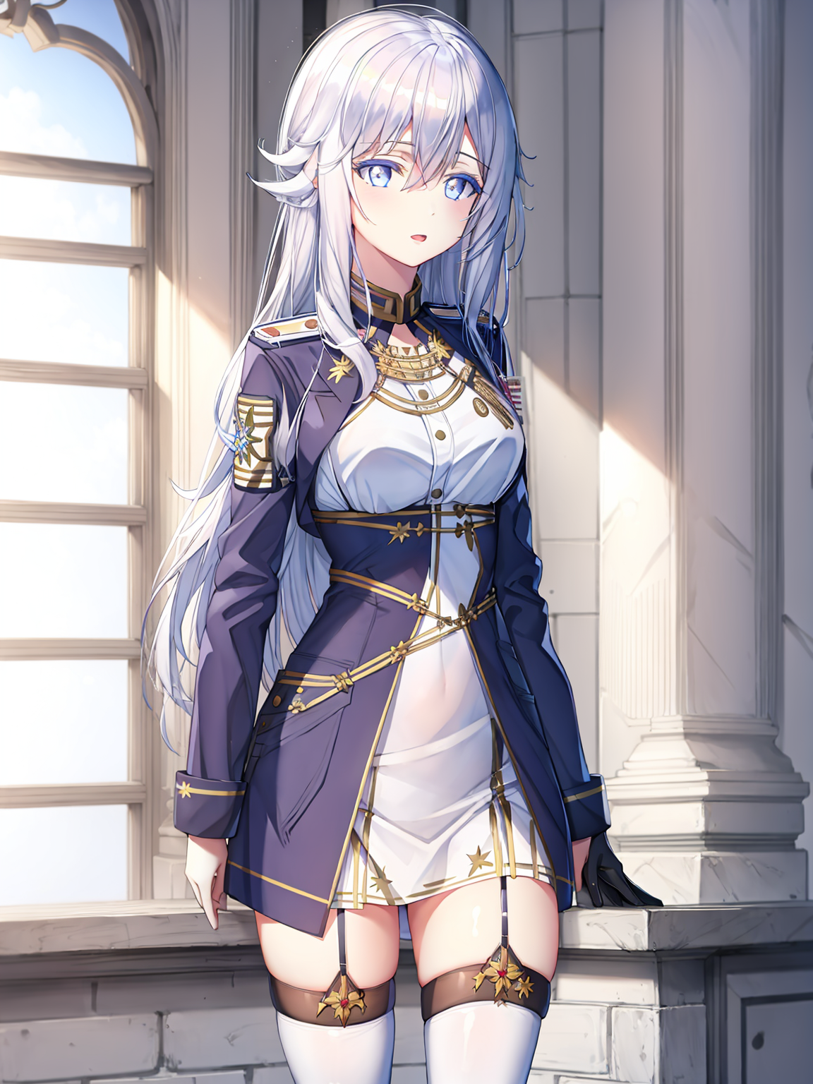 2. Full-body Features: Vladilena, 1girl, solo, thighhighs, ???????, long hair, garter straps, blue eyes, white thighhighs, looking at viewer, high heels, ?????????????, boots, blue jacket, open mouth, military, long sleeves, standing, military uniform, jacket, smile, full body, epaulettes, blue footwear, uniform, bangs, window, ?????????????, white hair, zettai ryouiki, grey hair, blush, dress, indoors, belt, high heel boots, short dress, aiguillette, cleavage
