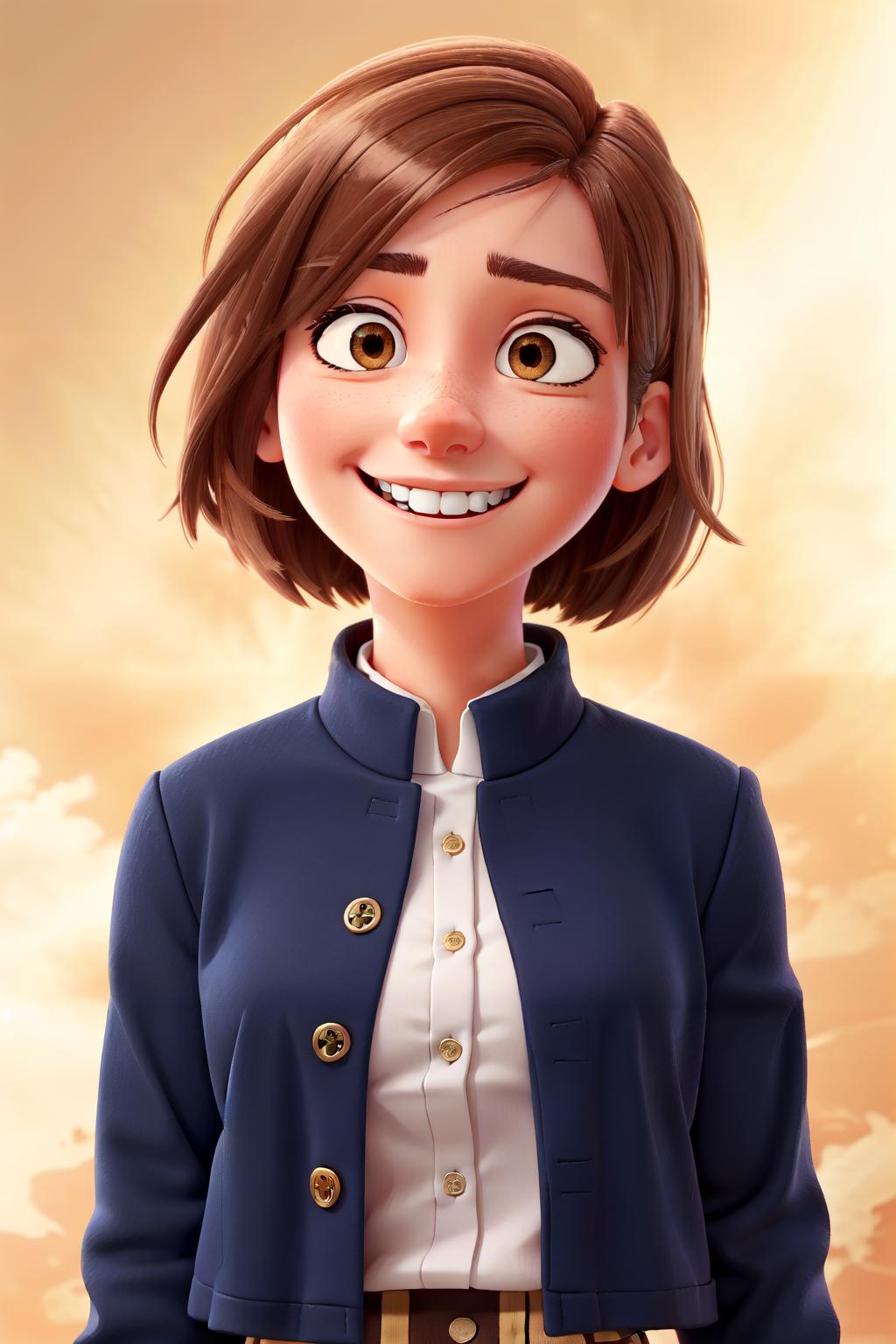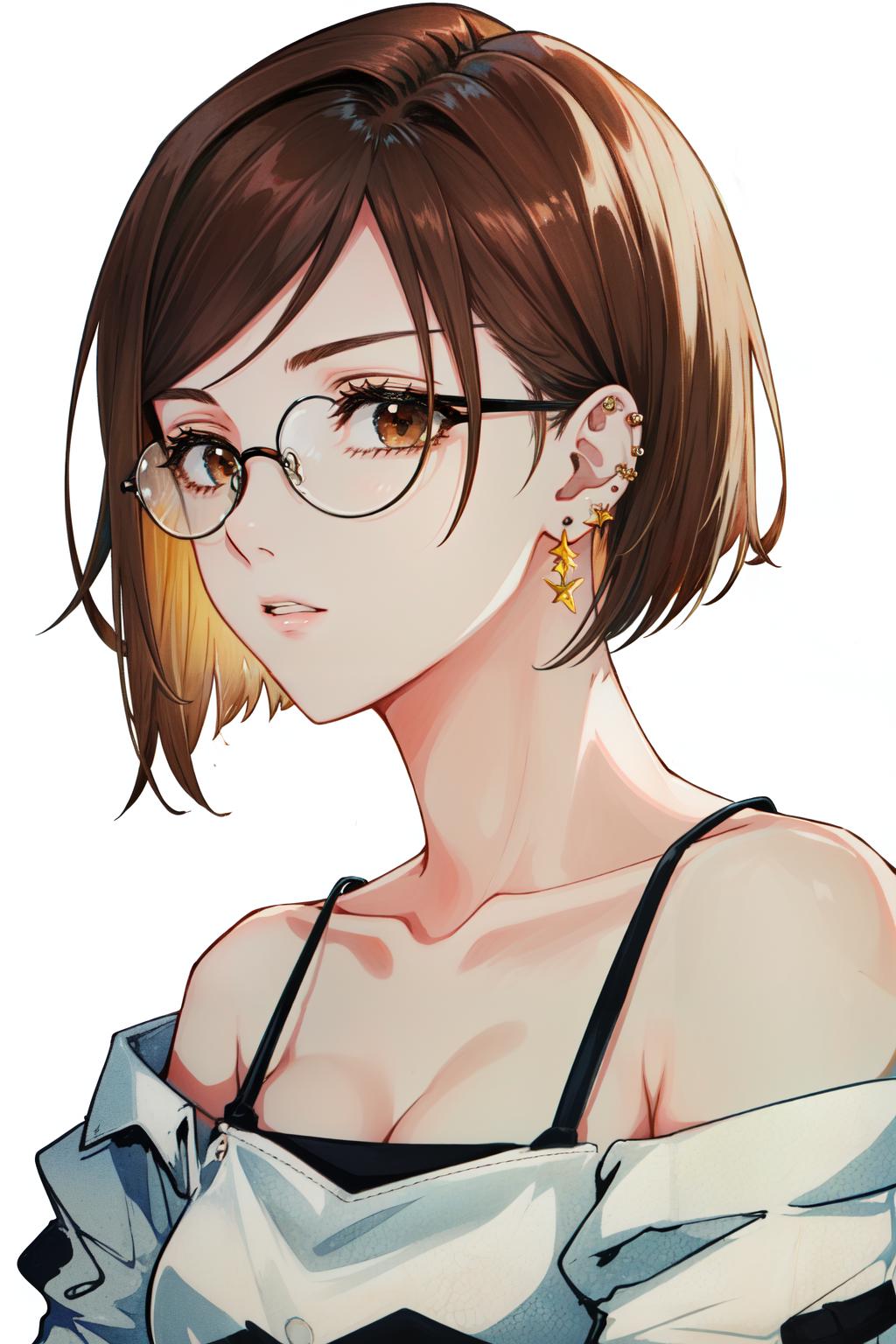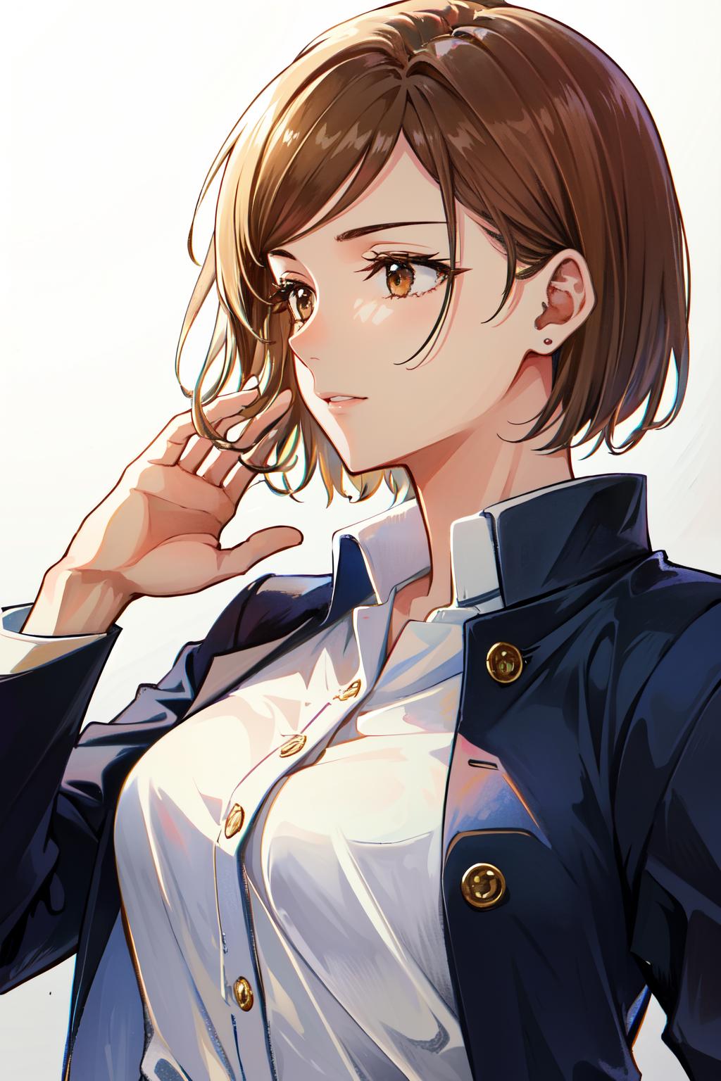 Tag suggestions: brown hair,brown eyes, short hair,hair behind ear , white shirt, jacket