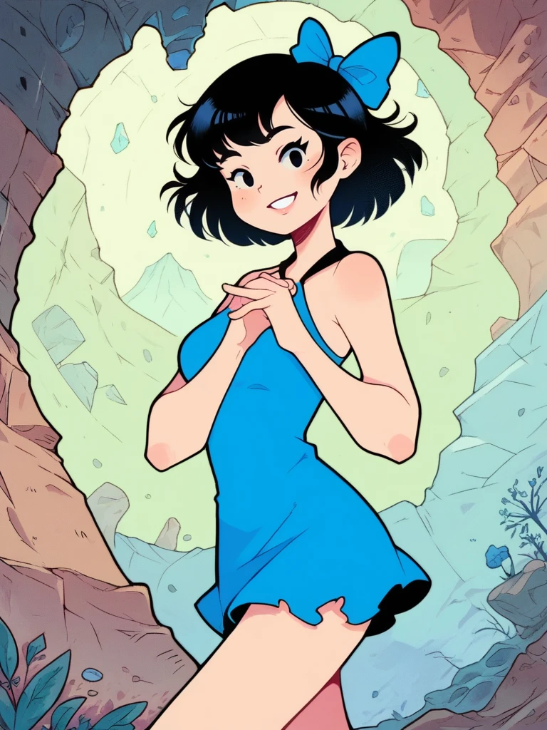 Outfit: "short hair, hair bow, black hair, black eyes, blue short dress, ???? legs, makeup"