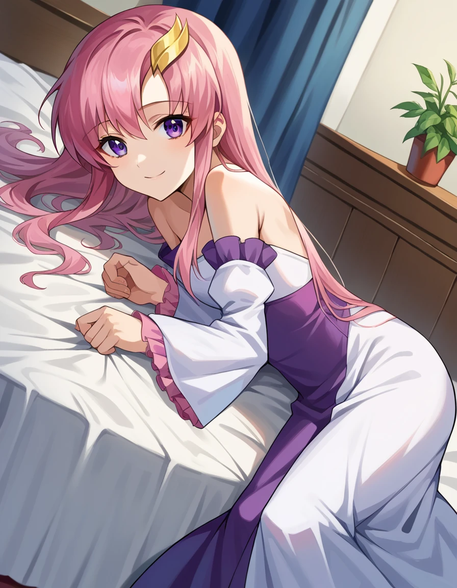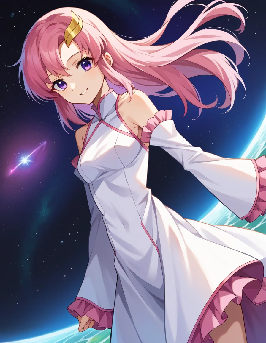 lacus clyne, purple eyes, hair ornament, long hair, wave hair ornament, pink hair,