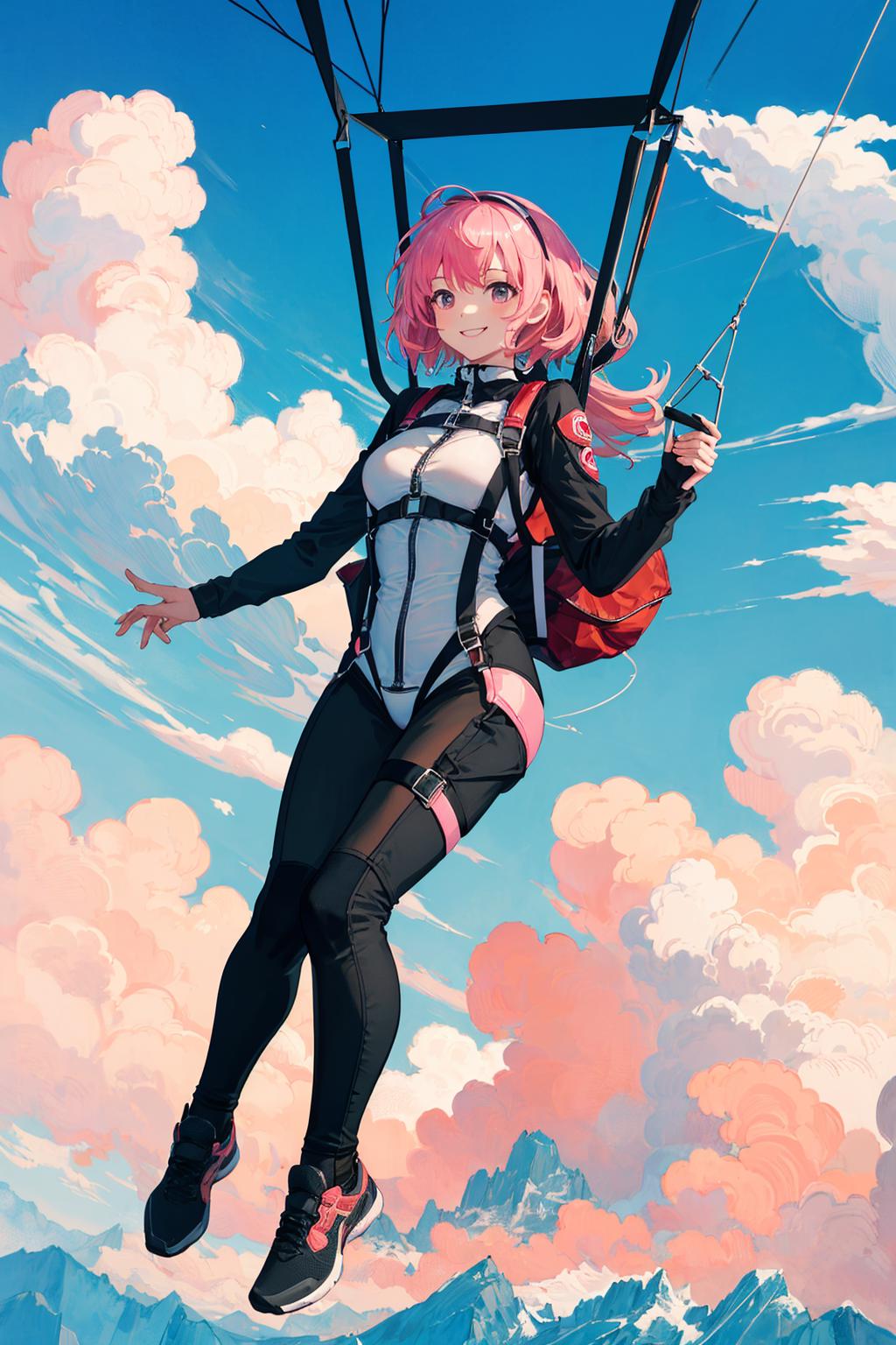 This is a parachute / skydiving LoRA. It will help you recreate poses of (mostly) woman in the air. It is trained with 50 manually cropped and high quality pictures. Use 768x768 or 512x768 resolution for best results.