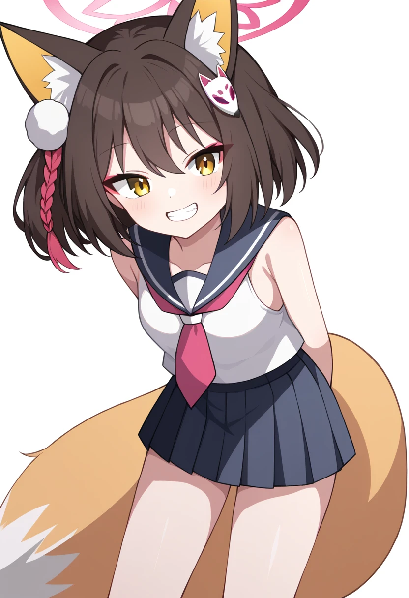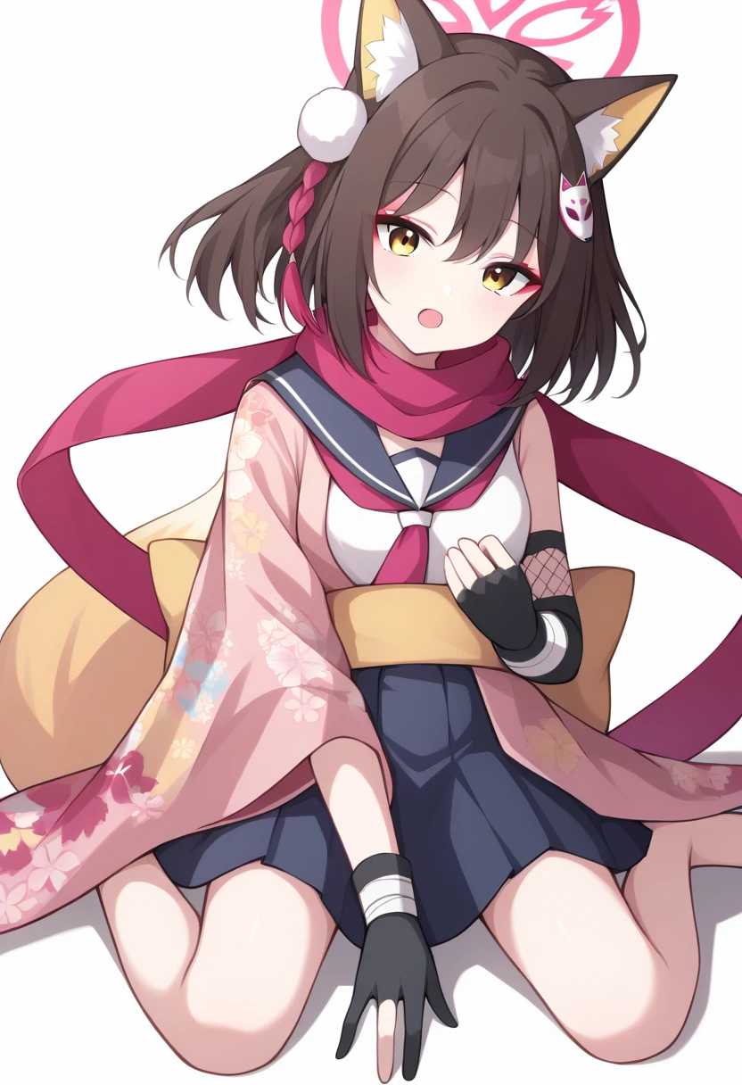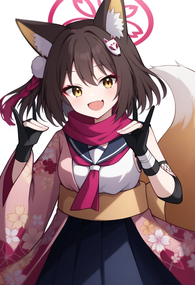 izuna \(blue archive\), halo, fox ears, fox tail, japanese clothes, floral print, sailor collar, skirt, scarf, partially fingerless gloves, black gloves, thigh strap, fishnets, single thighhigh