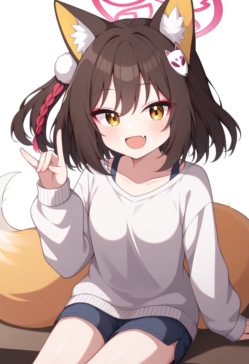 izuna \(swimsuit\) \(blue archive\), halo, fox ears, fox tail, striped ??????, visor cap, denim shorts, scarf, hair flower, arm scrunchie