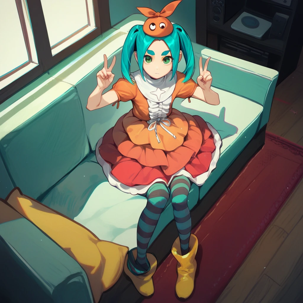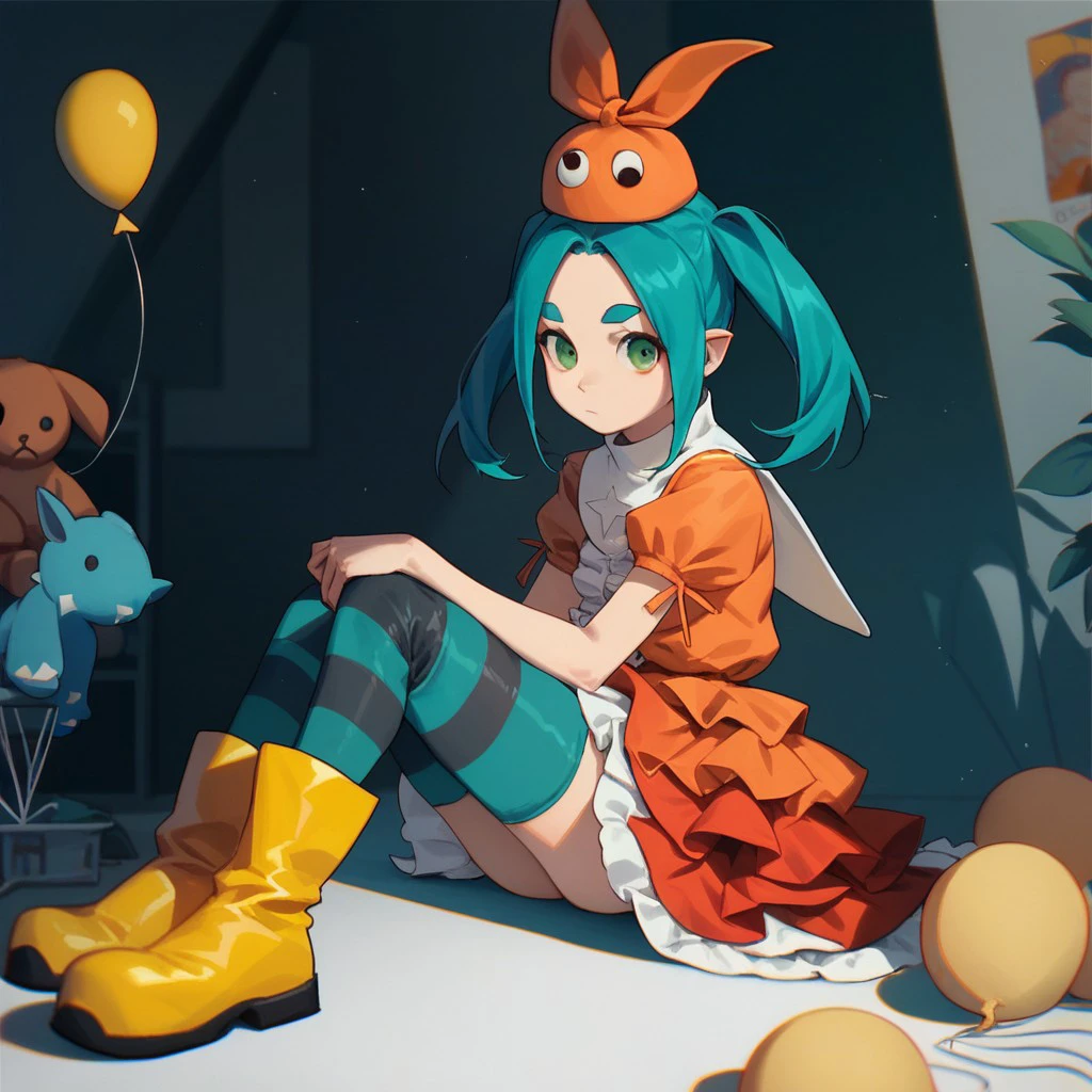 orange hat, gradient dress, orange dress, frills, short sleeves, striped thighhighs, striped , yellow rubber boots,