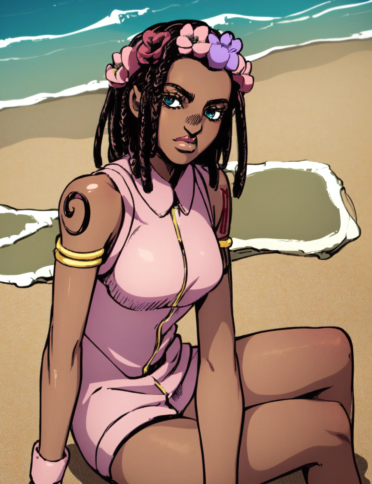 outfit: bikini, jewelry, dreadlocks, necklace, red flowers, purple flowers, lipstick, purple lipstick