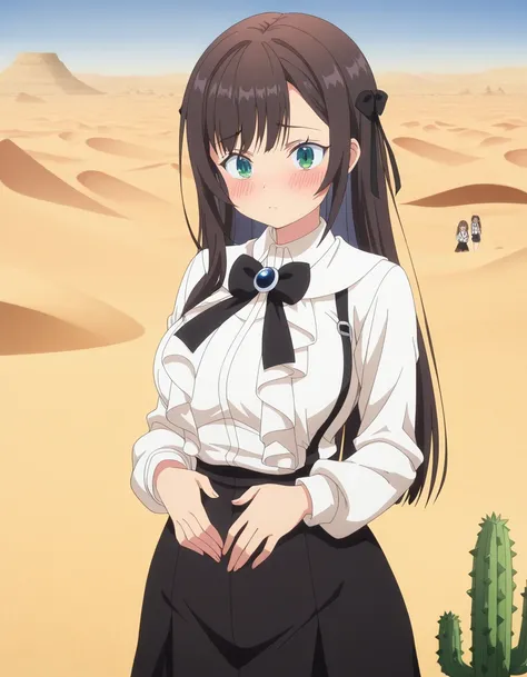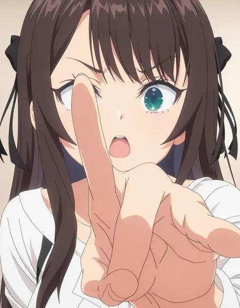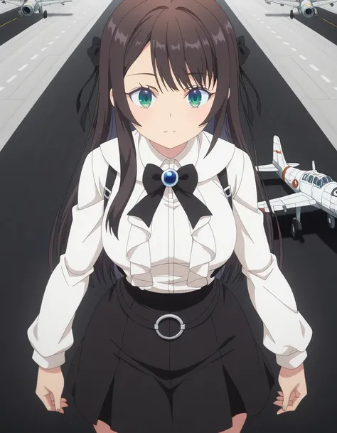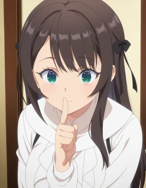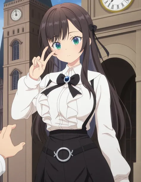 alina clover, long hair, bangs, brown hair, black hair, green eyes, hair bow, sidelocks, mature female, breasts, anime screencap