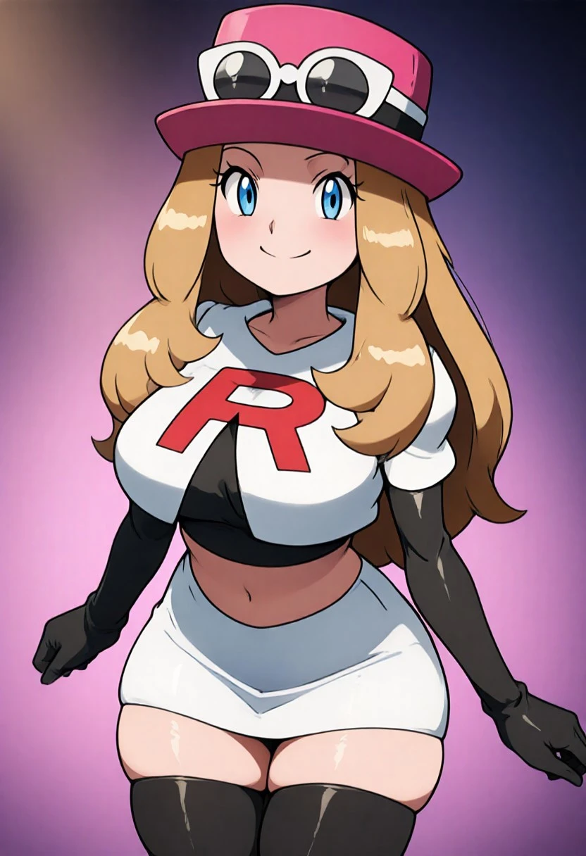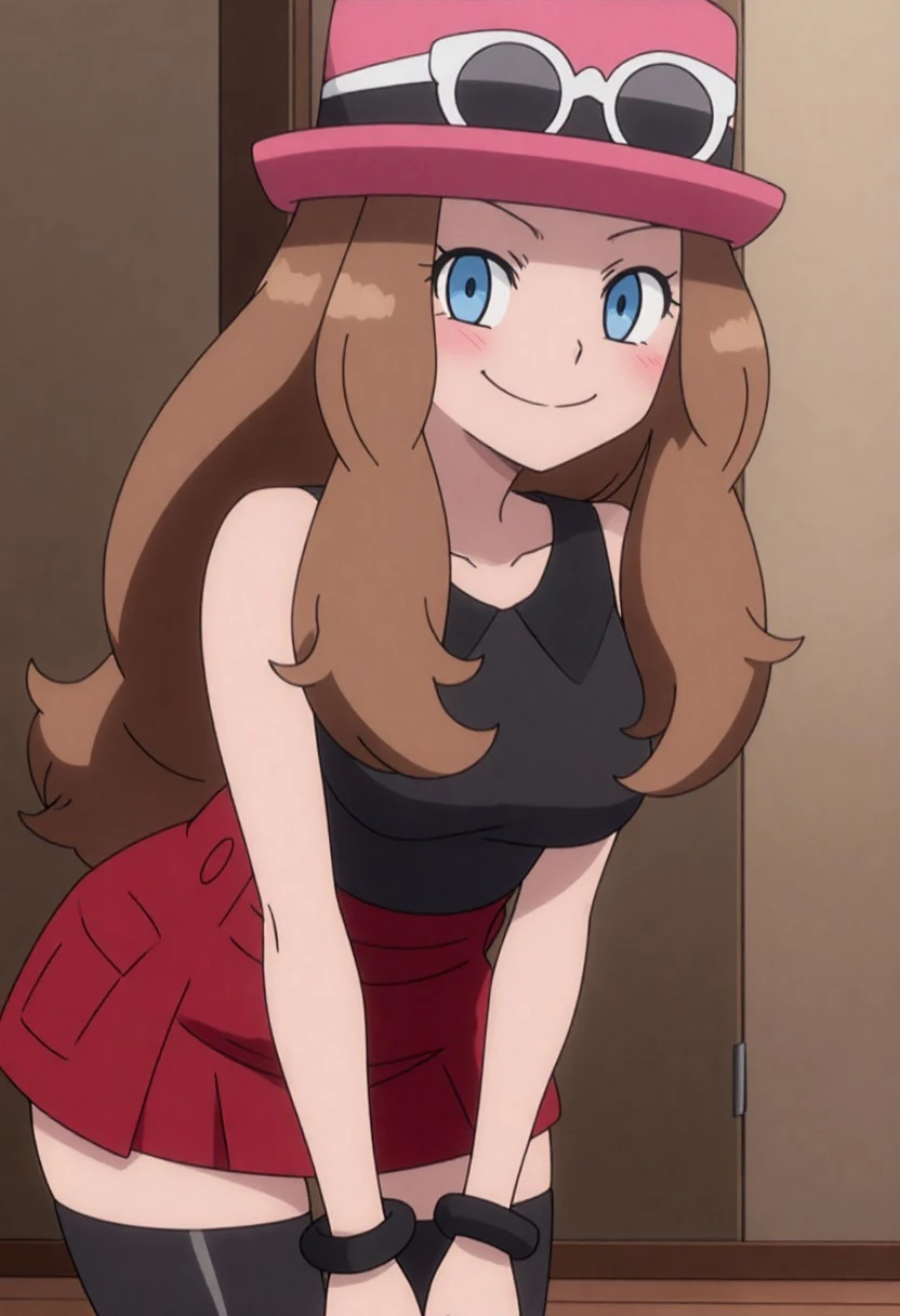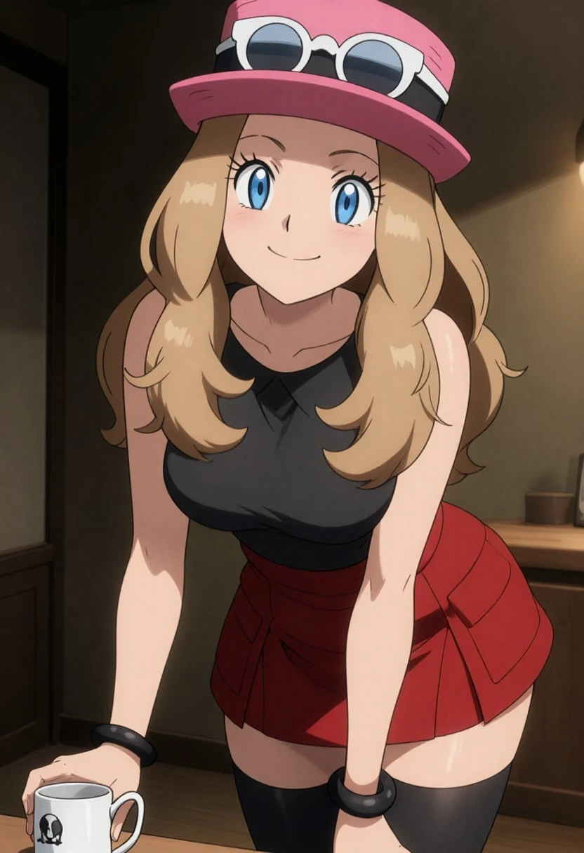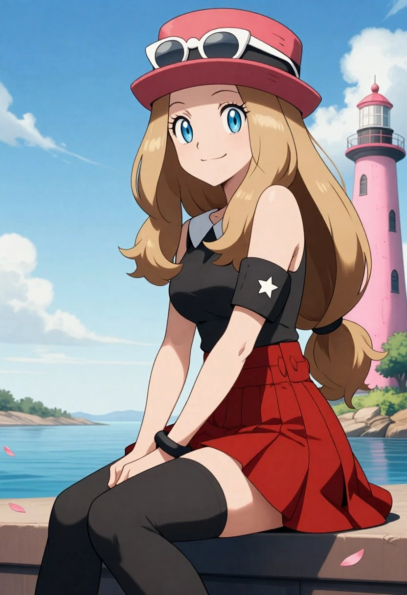 zzSerena, blue eyes, long hair, eyewear on headwear, pink headwear, eyelashes, sleeveless shirt, black shirt, bracelet, high-waist skirt, red skirt, black thighhighs,