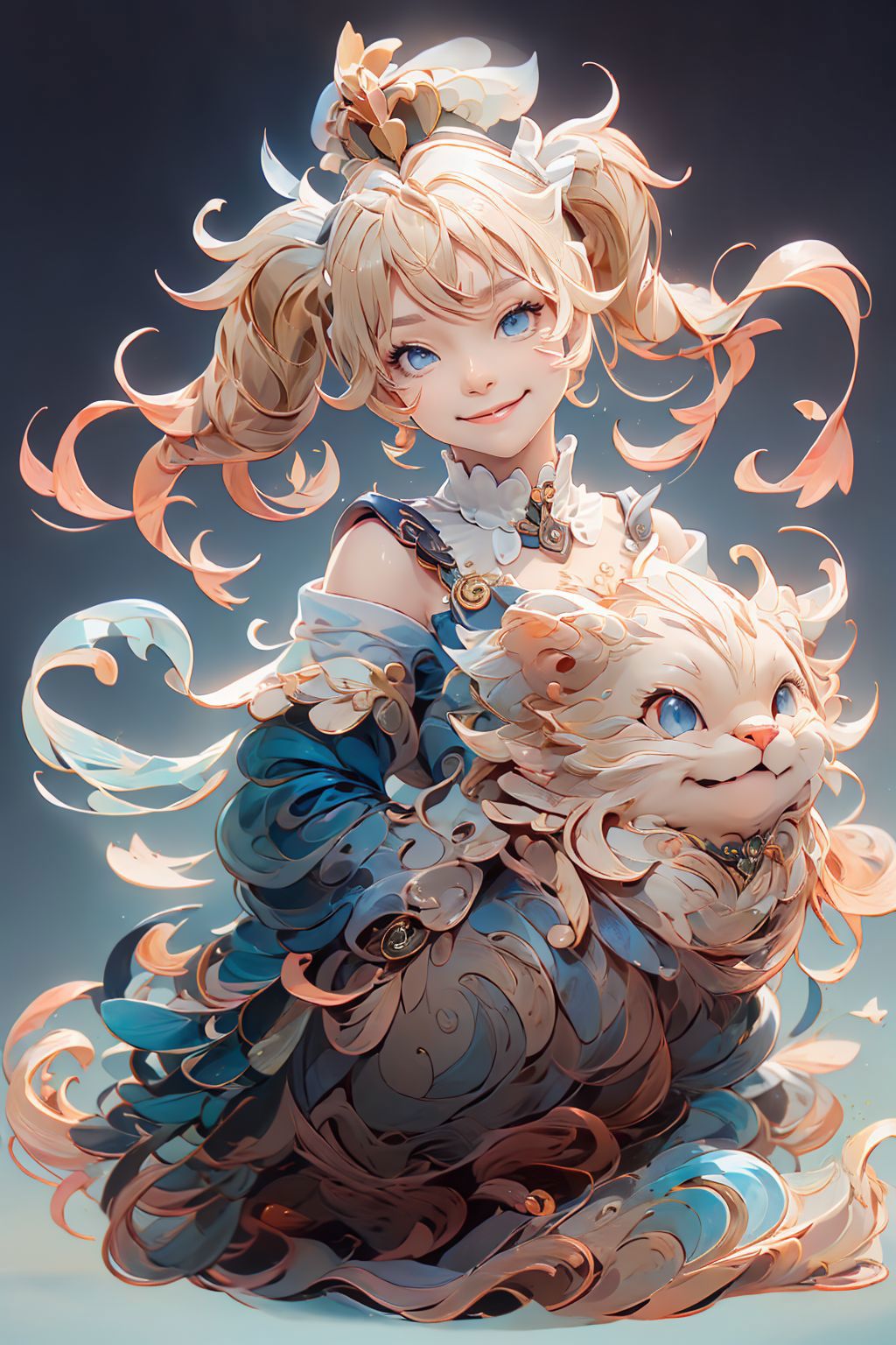 1girl,barbara \(genshin impact\),smile,official alternate costume, choker,sailor hat,hat flower,blue eyes,blonde hair,twintails,blue one-piece swimsuit,yellow bow,detached sleeves,animal bag,blue sailor collar,striped bow,bare shoulders,thigh strap