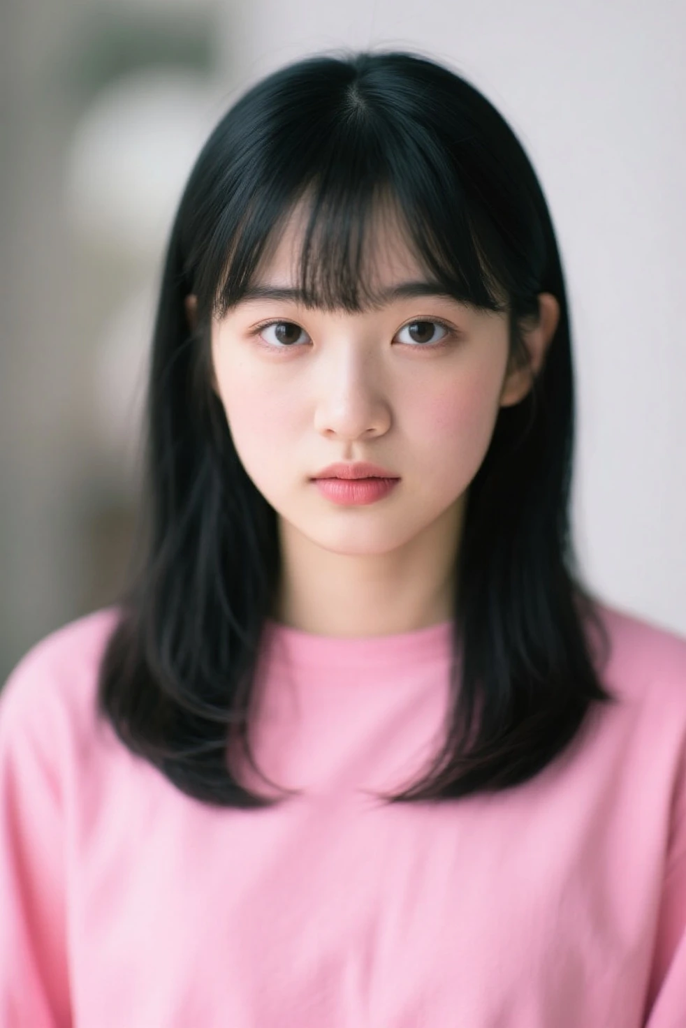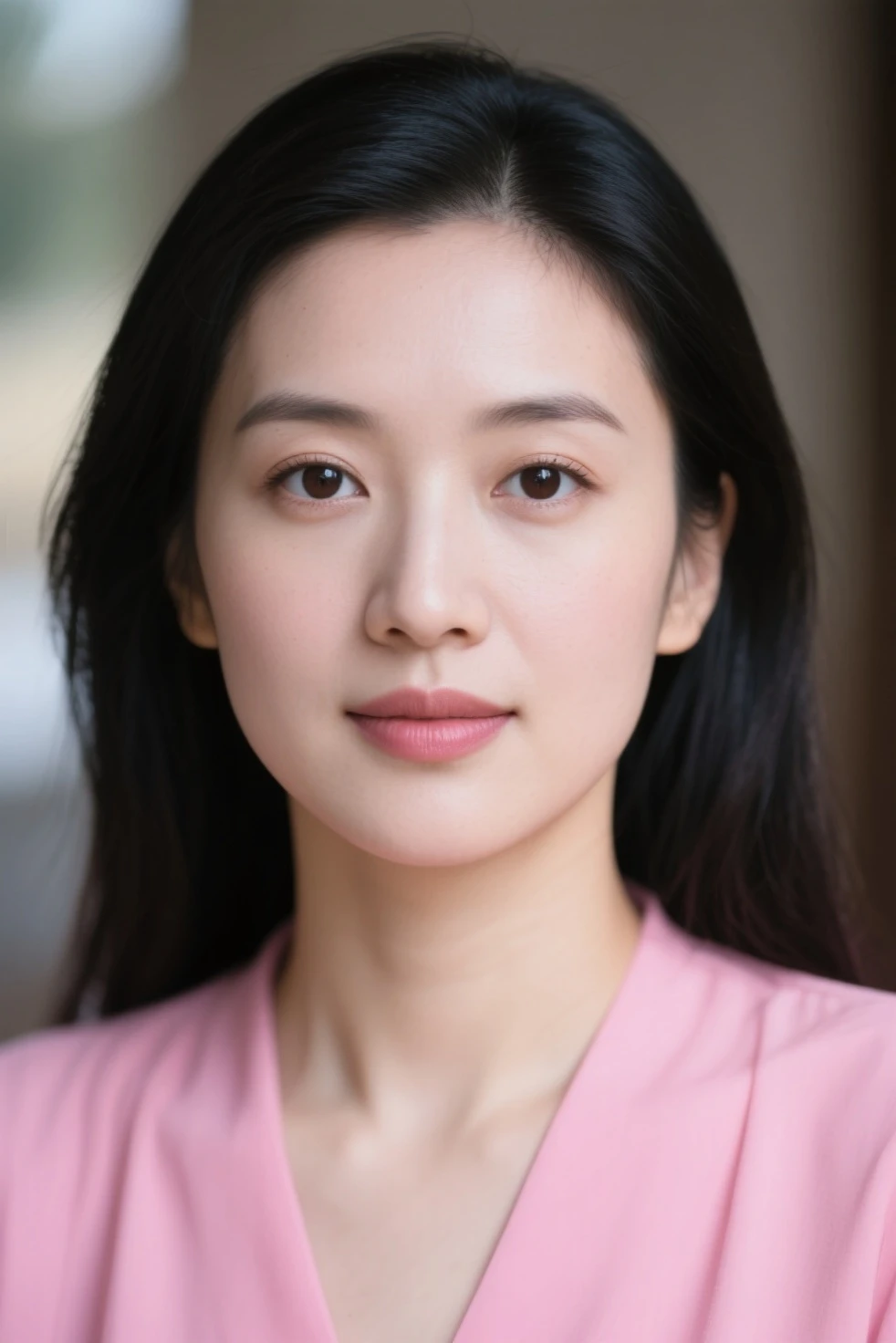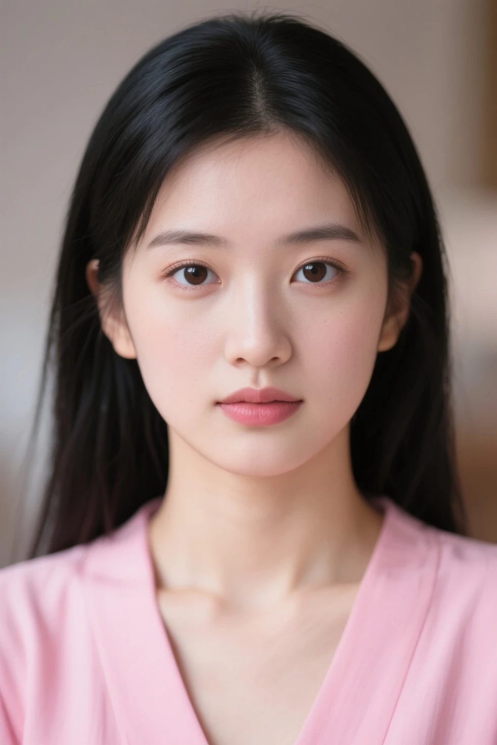 1girl, Asian, black eyes, black hair, pink outfit, looking at viewer, frontal view, centered, symmetrical composition, medium close up, blurry background, shallow depth of field.