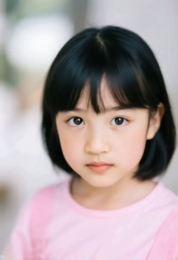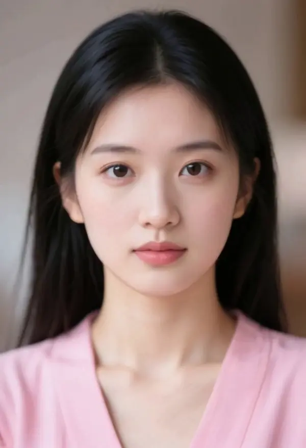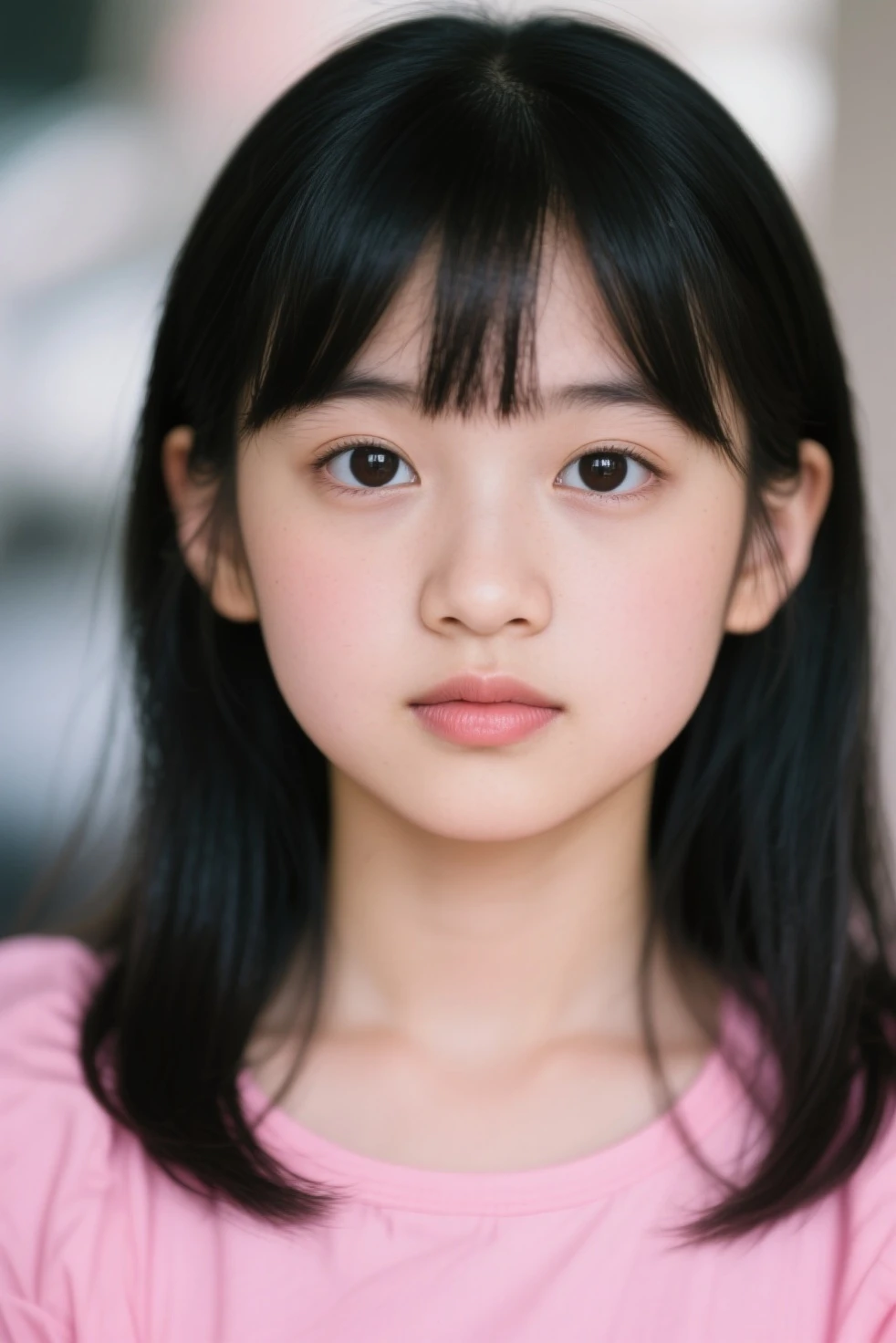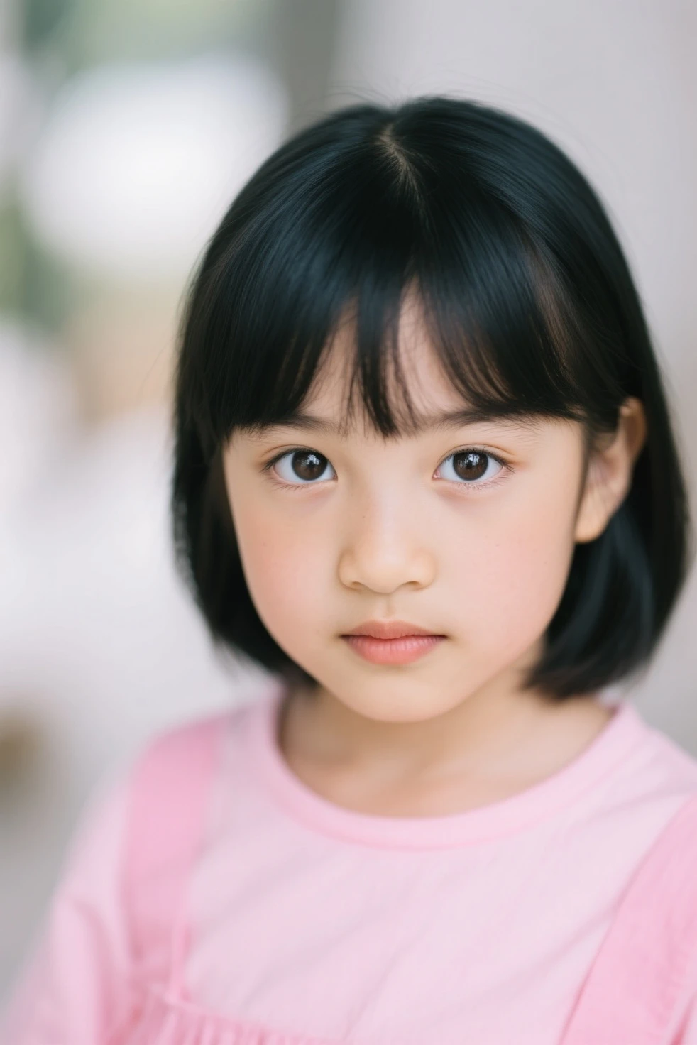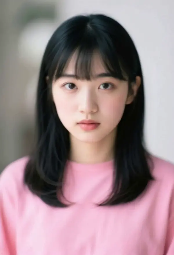 1girl, Asian, black eyes, black hair, pink outfit, looking at viewer, frontal view, centered, symmetrical composition, medium close up, blurry background, shallow depth of field.