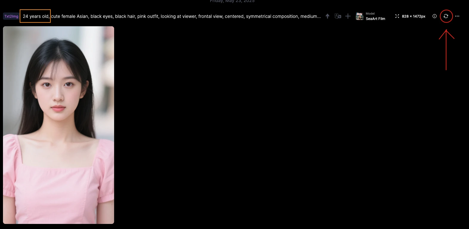 24 years old, cute female Asian, black eyes, black hair, pink outfit, looking at viewer, frontal view, centered, symmetrical composition, medium close up, blurry background, shallow depth of field.d. Regenerate (look at red mark on the image below), Tweak the age (minimum is 18 years old, below that is censored)