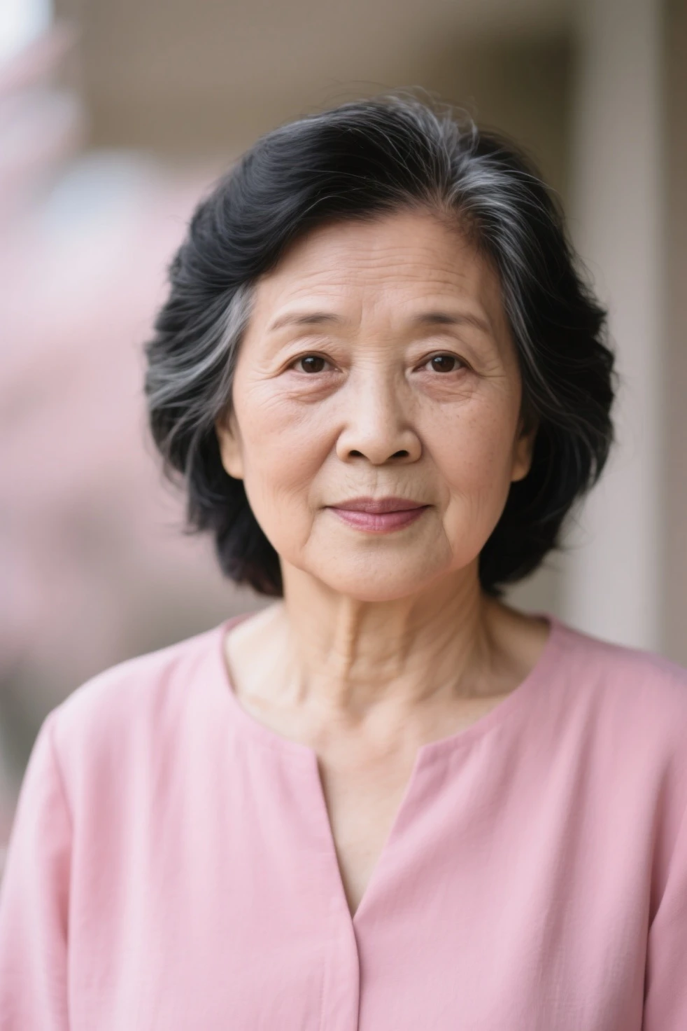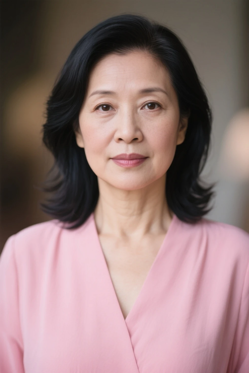 1girl, cute female Asian, black eyes, black hair, pink outfit, looking at viewer, frontal view, medium close up, blurry background, shallow depth of field.