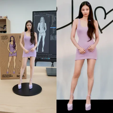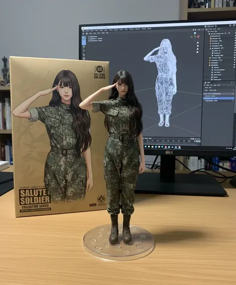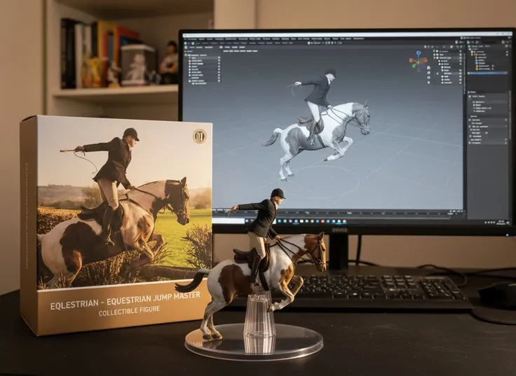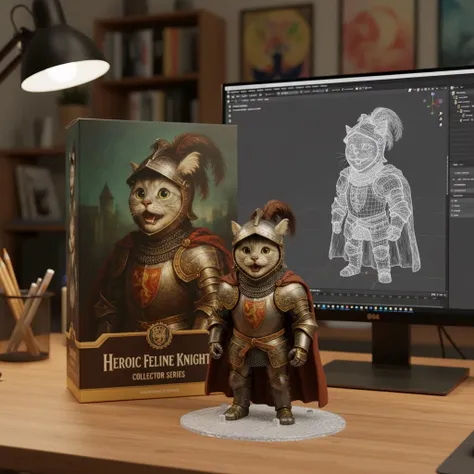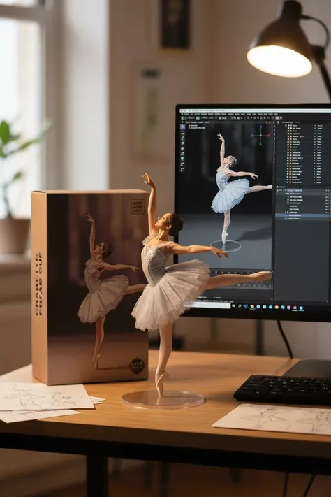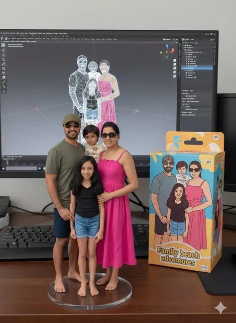 Trasforma la foto in una figura di carattere visualizzata su una base di plastica rotonda, con un processo di modellazione Blender sullo schermo del computer e l'immagine del personaggio stampata sulla scatola dietro di esso.