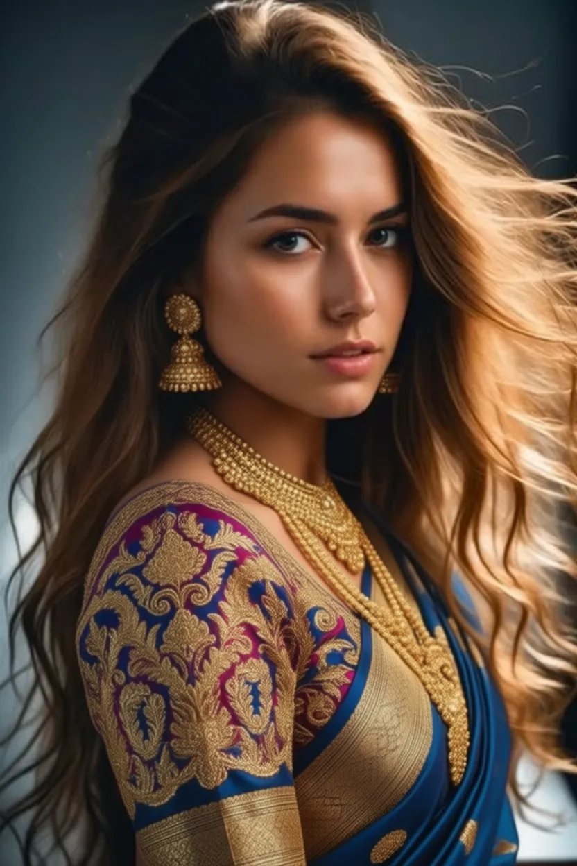 Trasforma qualsiasi ritratto in una regale celebrazione indiana. Vivaci drappeggi di seta scorrono con intricati ricami d'oro mentre collane e orecchini tradizionali catturano la luce. Eredità culturale, Elegance , e bellezza senza tempo in ogni inquadratura.