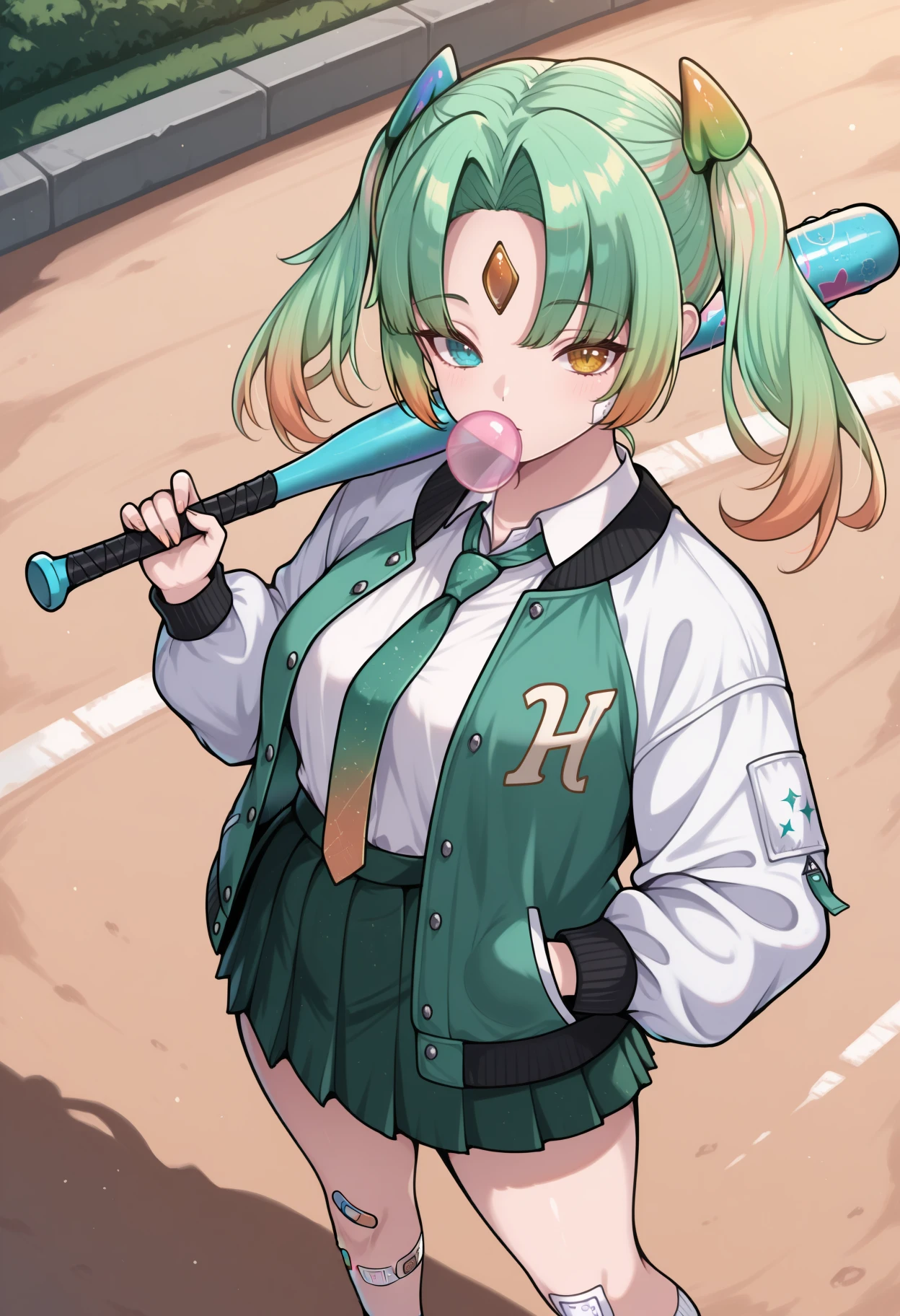 heithrFE, twintails, green hair, streaked hair, heterochromia, forehead jewel,