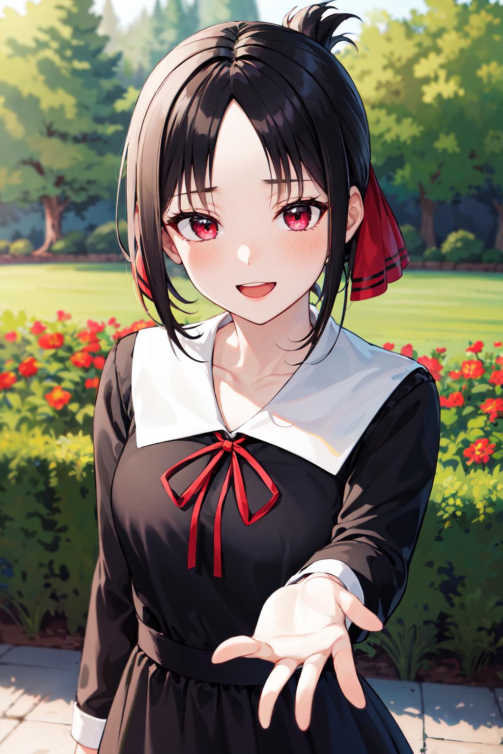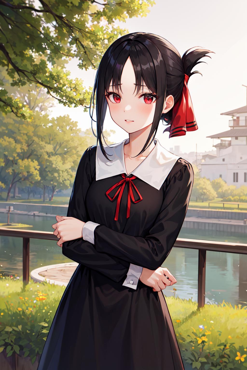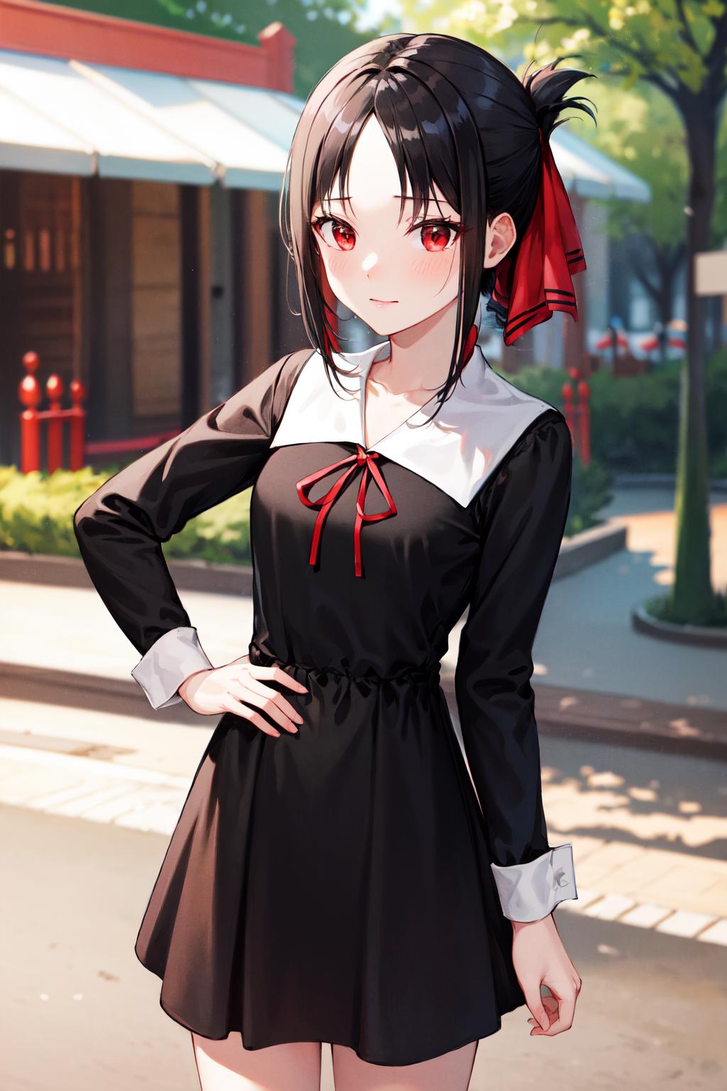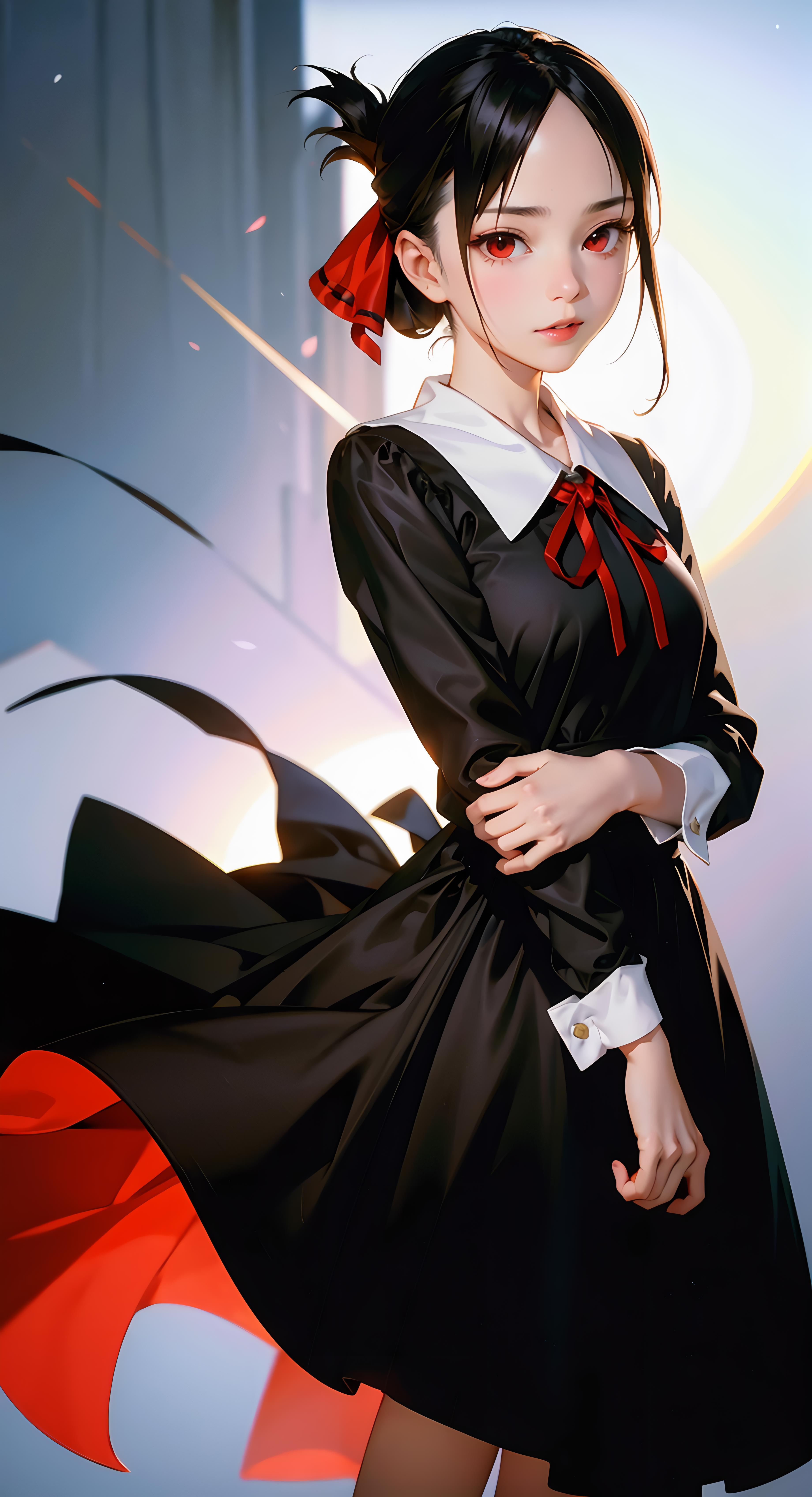 aakaguya, short hair, folded ponytail, hair ribbon, parted bangs, neck ribbon, red ribbon, black dress, black shirt, long sleeves, black sleeves