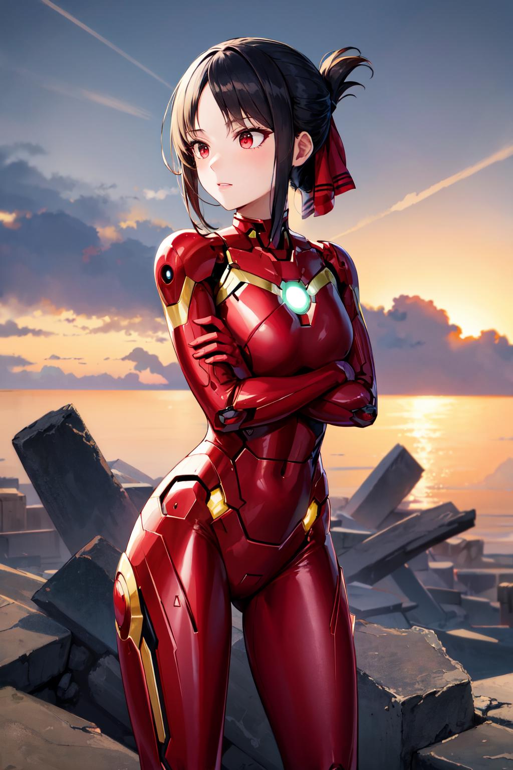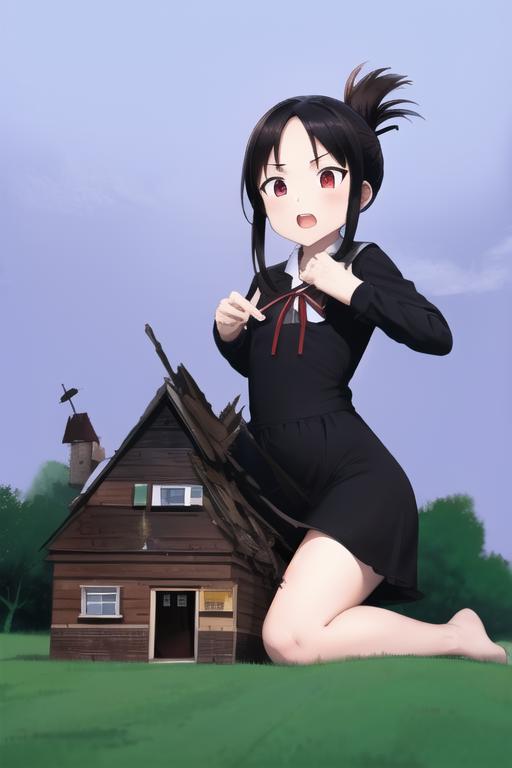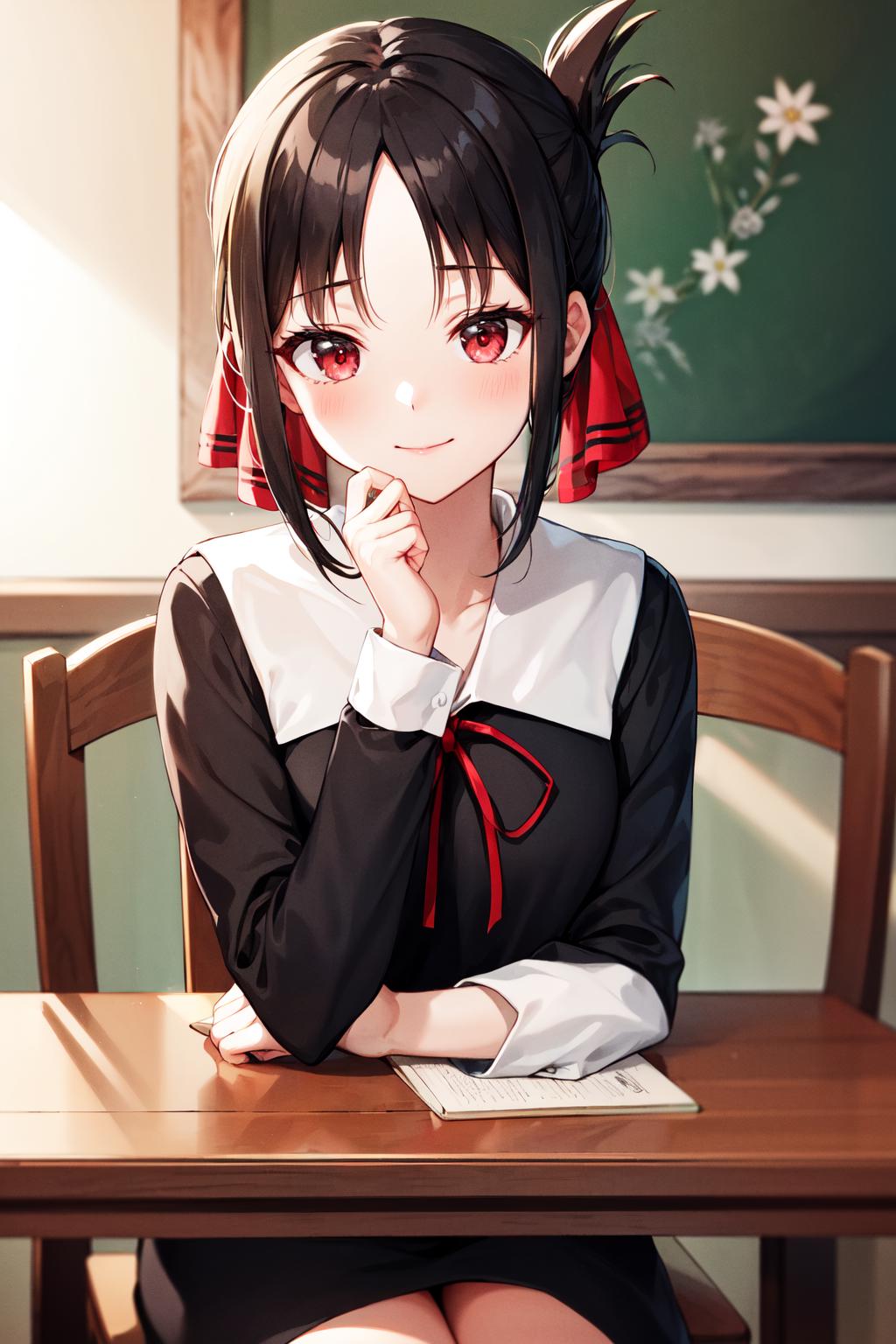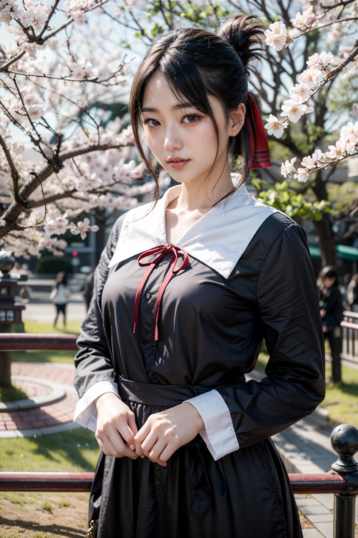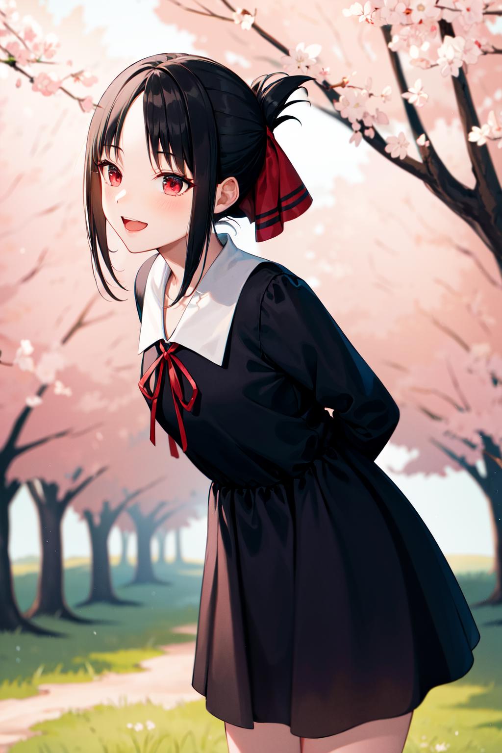 aakaguya, short hair, folded ponytail, hair ribbon, parted bangs, neck ribbon, red ribbon, black dress, black shirt, long sleeves, black sleeves