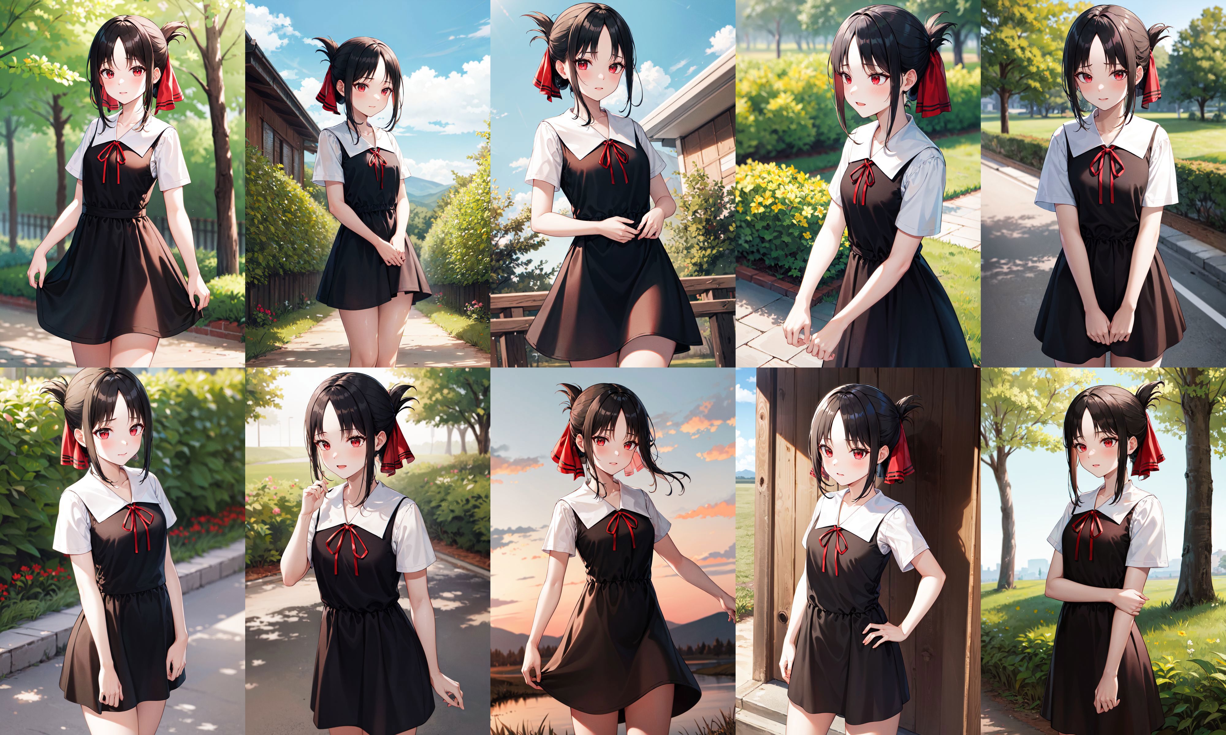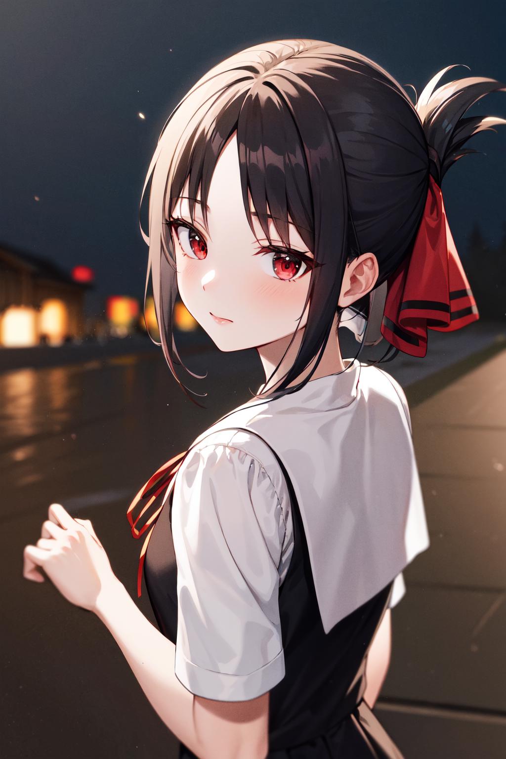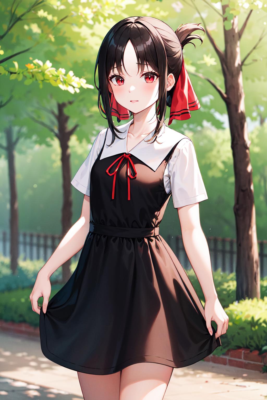 bbkaguya, short hair, folded ponytail, hair ribbon, parted bangs, neck ribbon, red ribbon, pinafore dress, white shirt, short sleeves