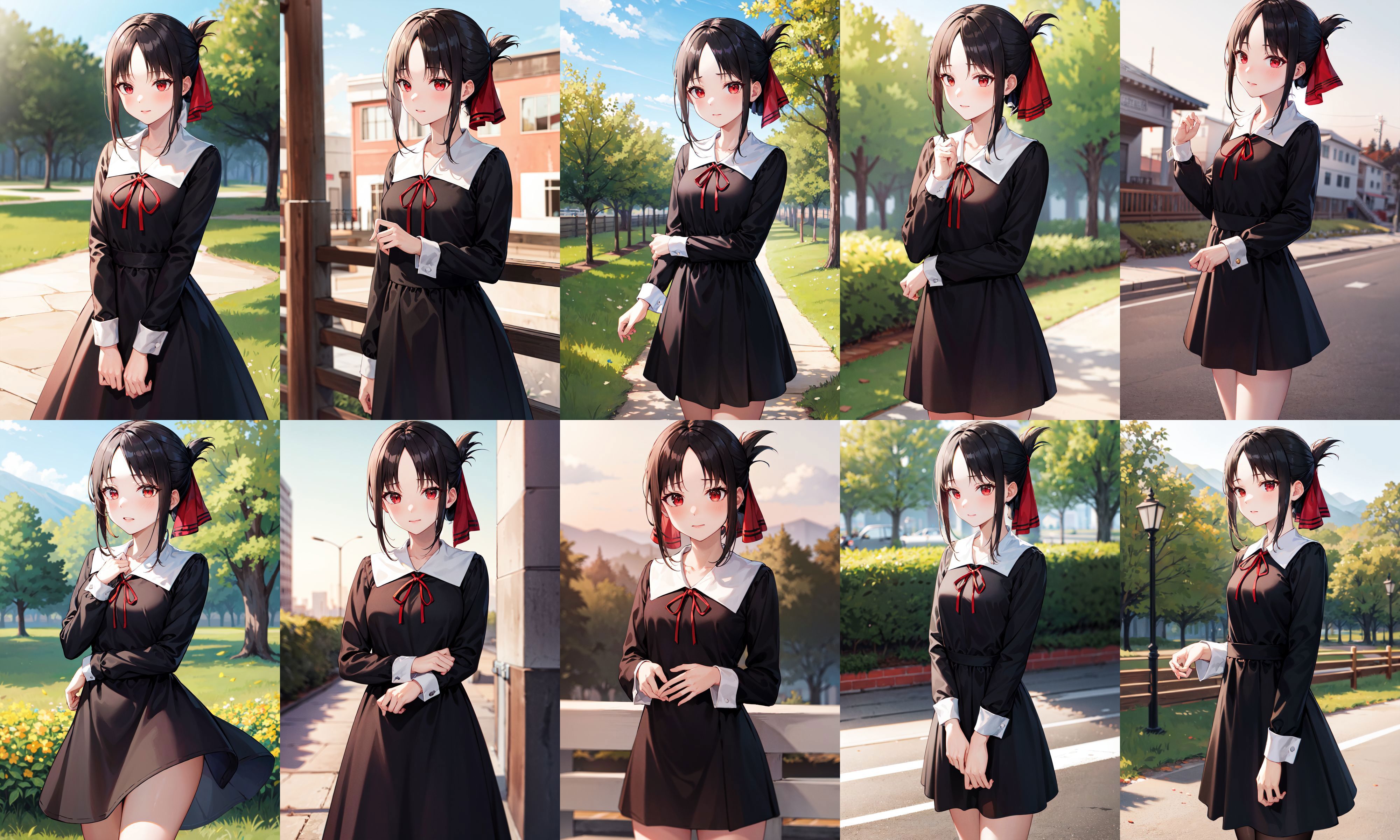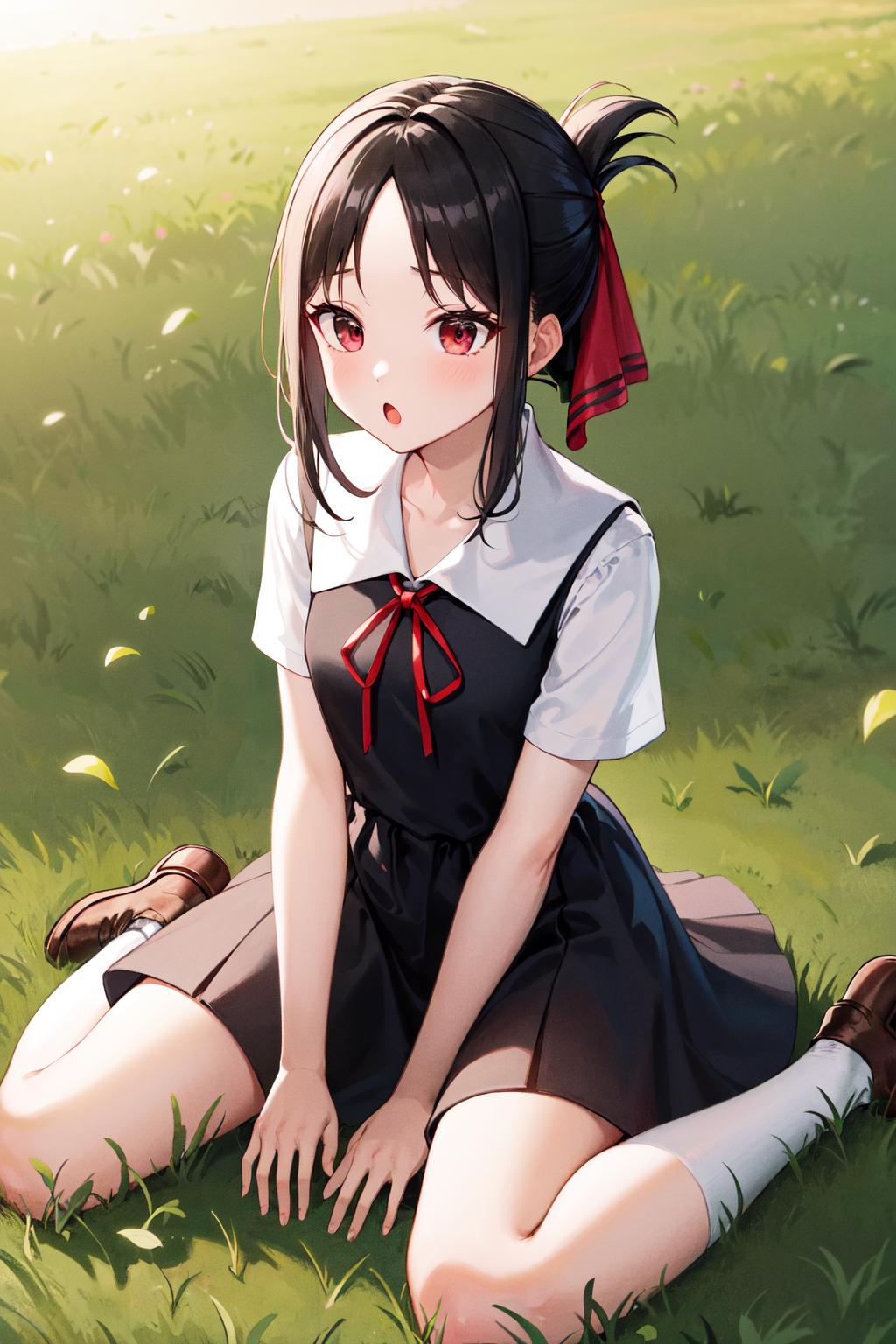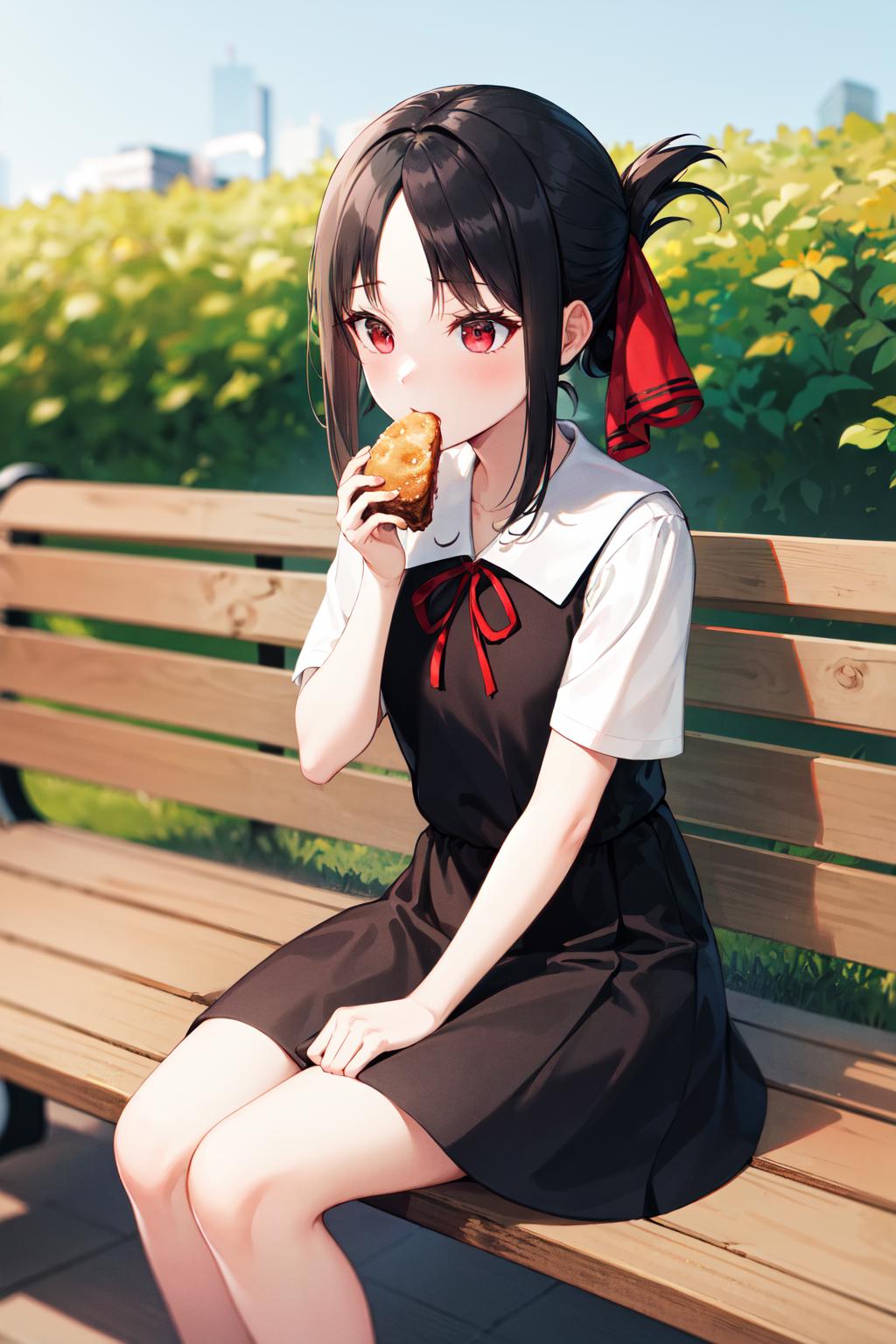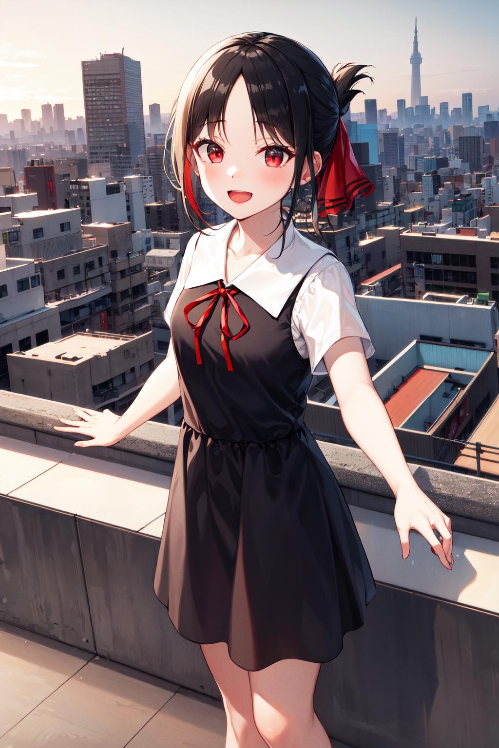 bbkaguya, short hair, folded ponytail, hair ribbon, parted bangs, neck ribbon, red ribbon, pinafore dress, white shirt, short sleeves