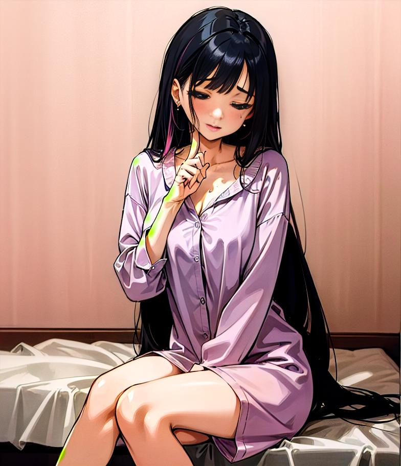 Long-sleeved shirts are chosen by sophisticated ladies to enhance their allure while sleeping. Activate Lora with the keyword 'sleeping shirt,' and you can add words like 'off shoulder' and 'see through' to further intensify the stimulation.