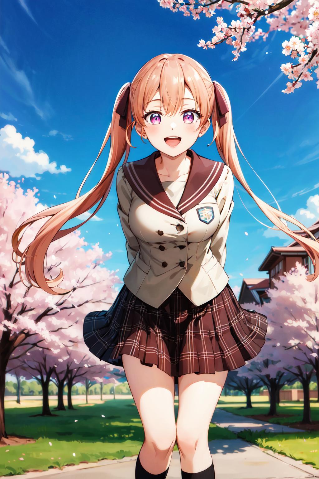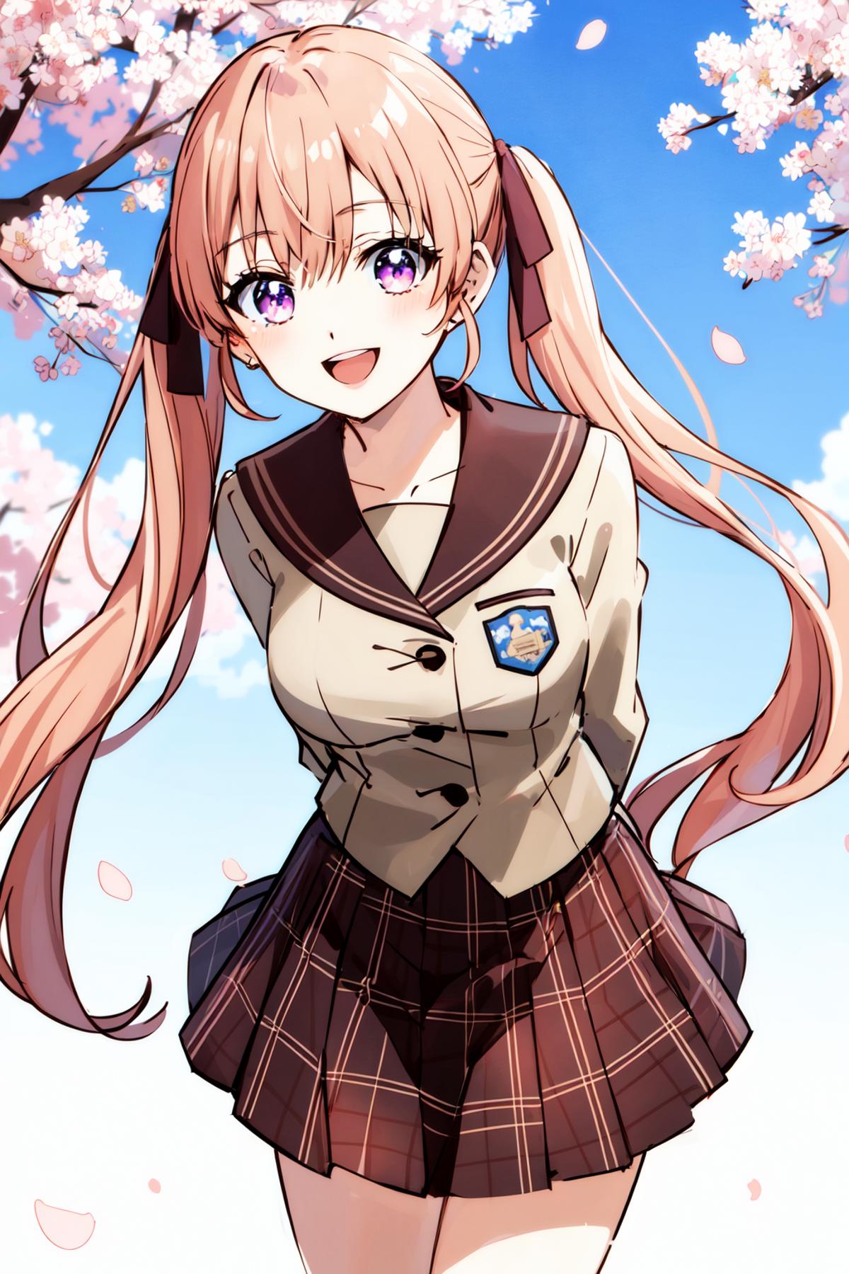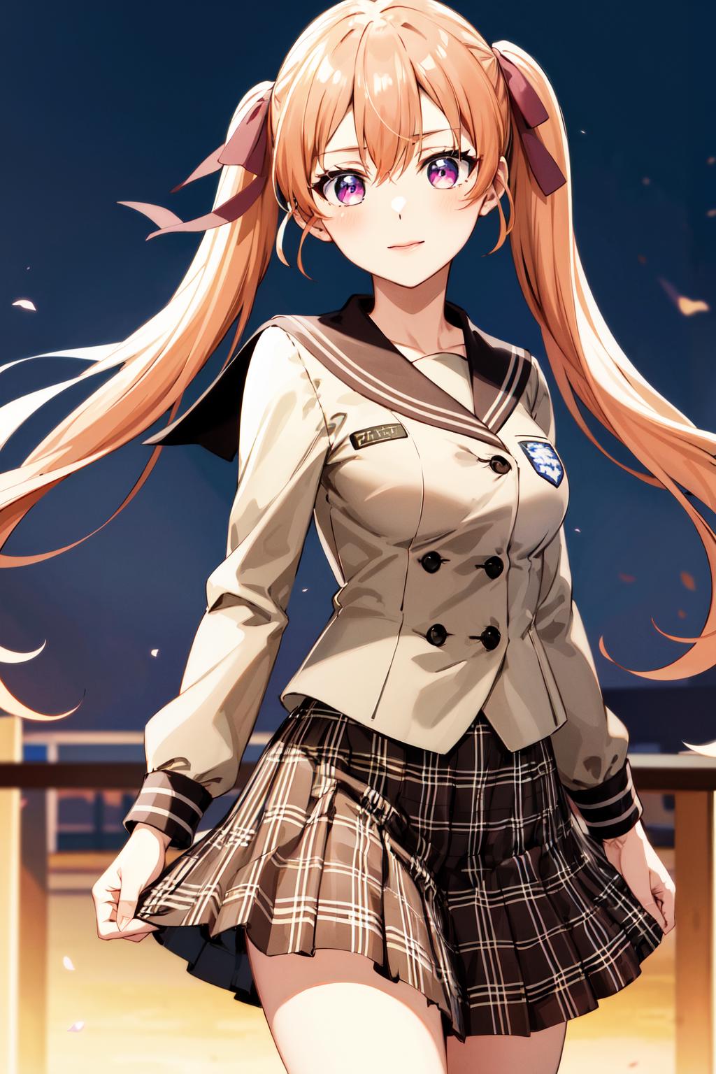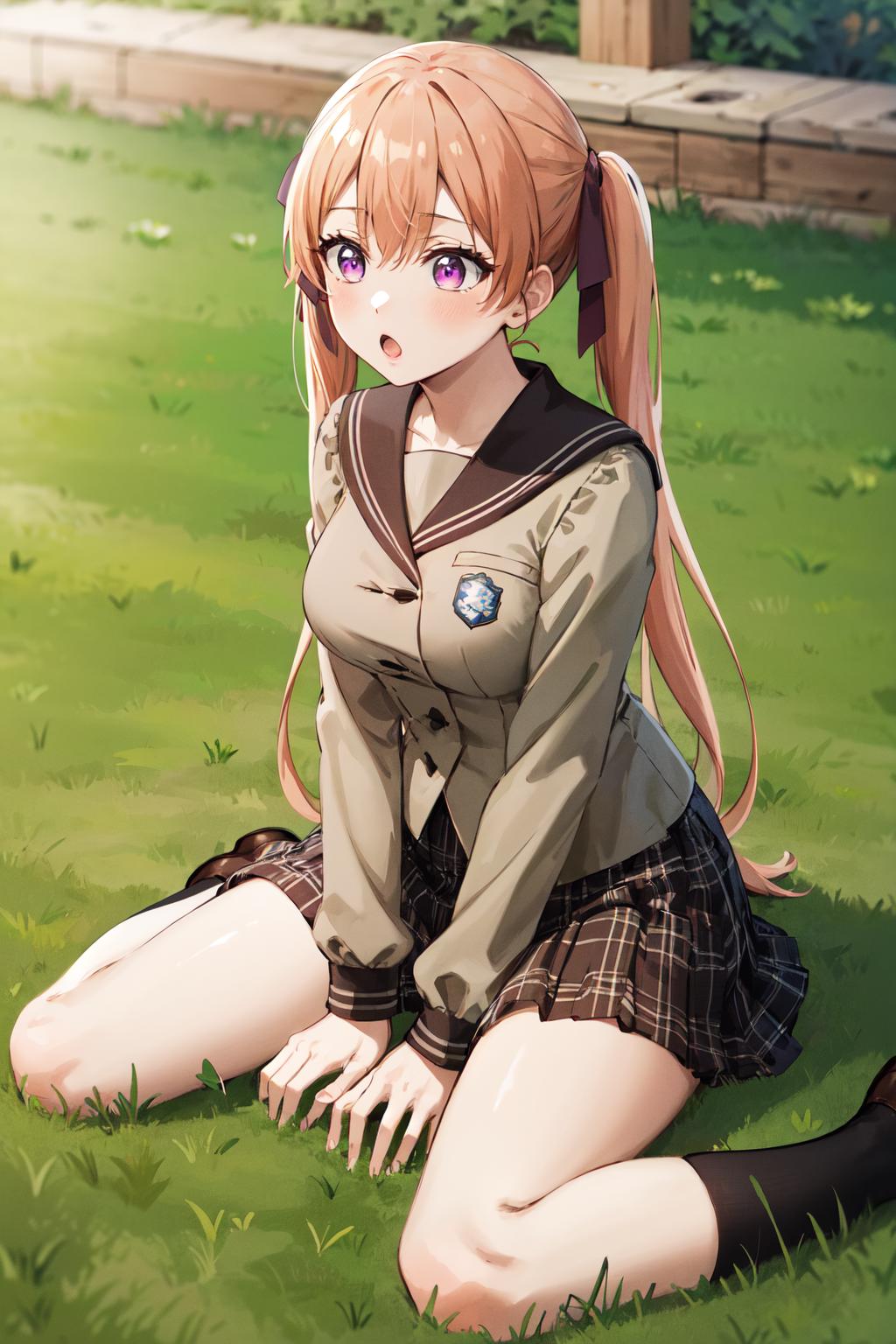 aaerika, long hair, twintails, hair ribbon, school uniform, serafuku, sailor collar, long sleeves, plaid skirt, brown skirt