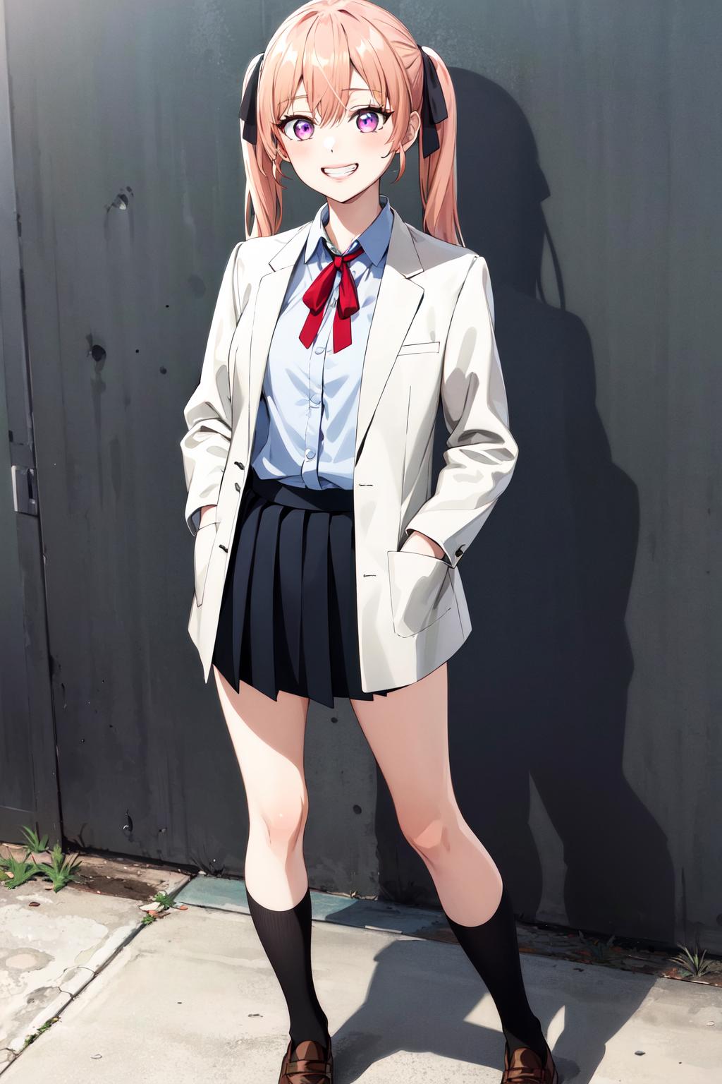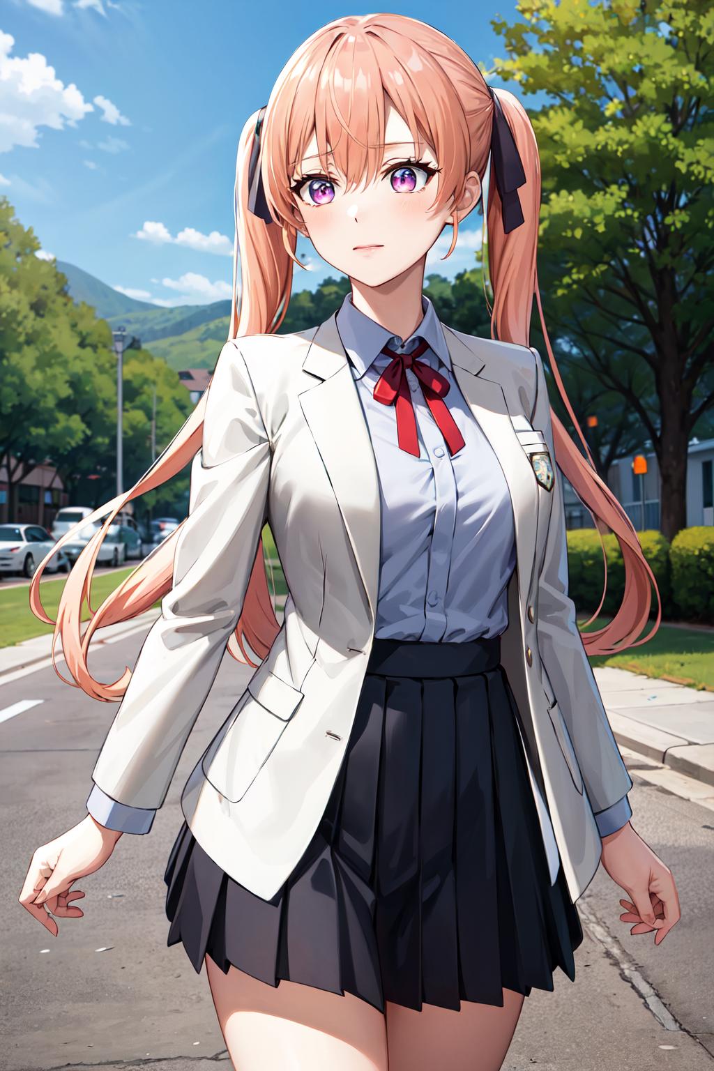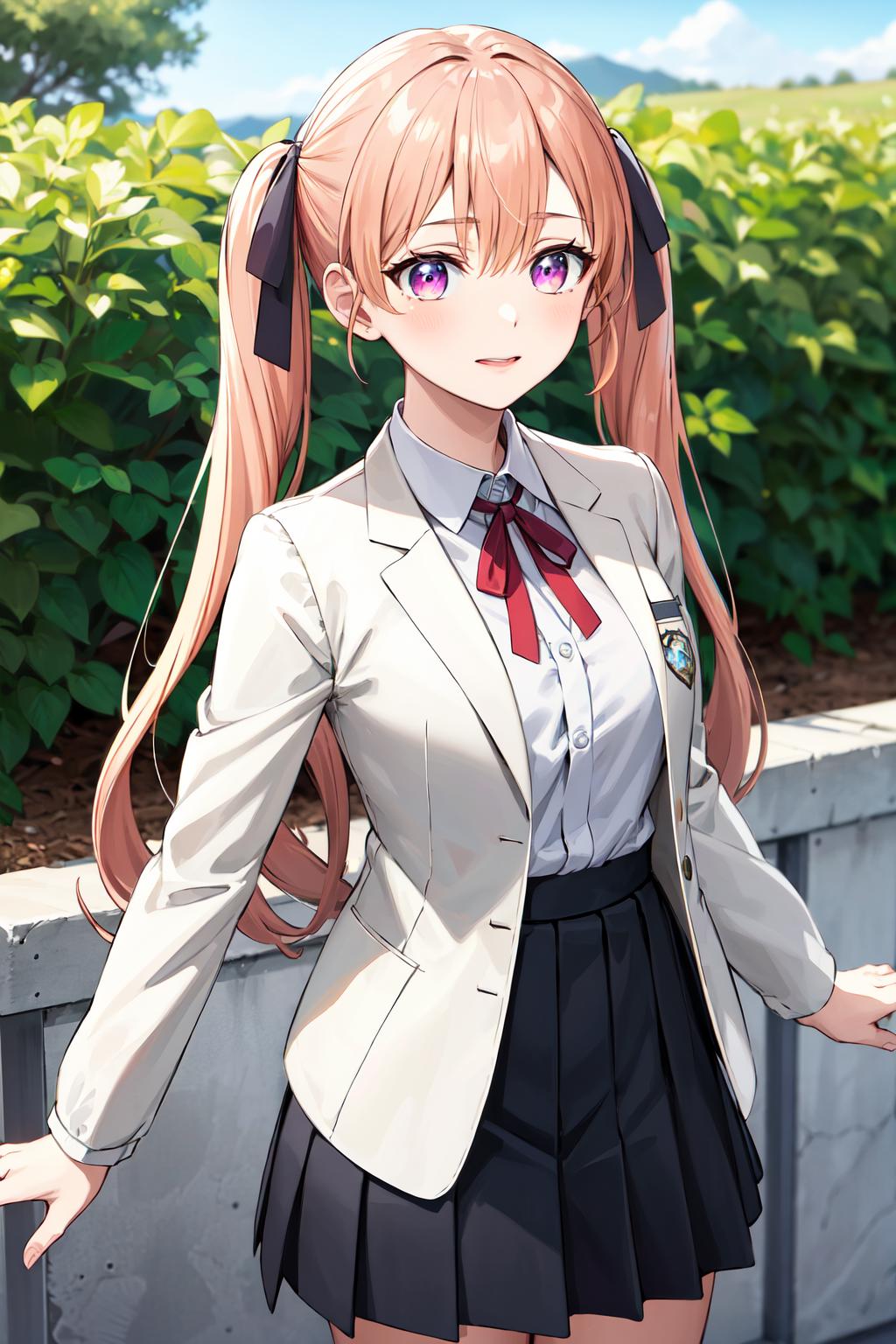 aaerika, long hair, twintails, hair ribbon, school uniform, neck ribbon, collared shirt, white jacket, black skirt, pleated skirt