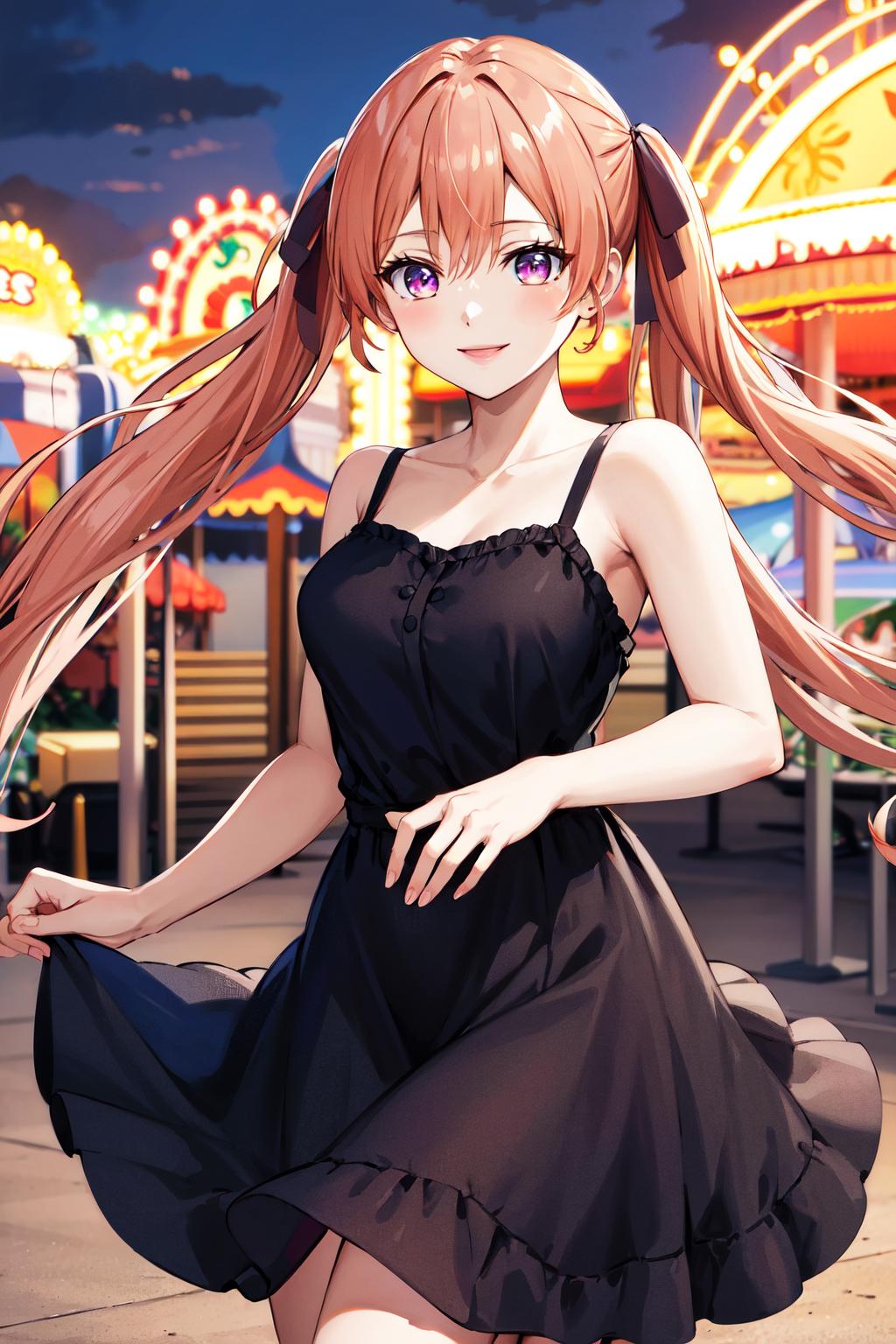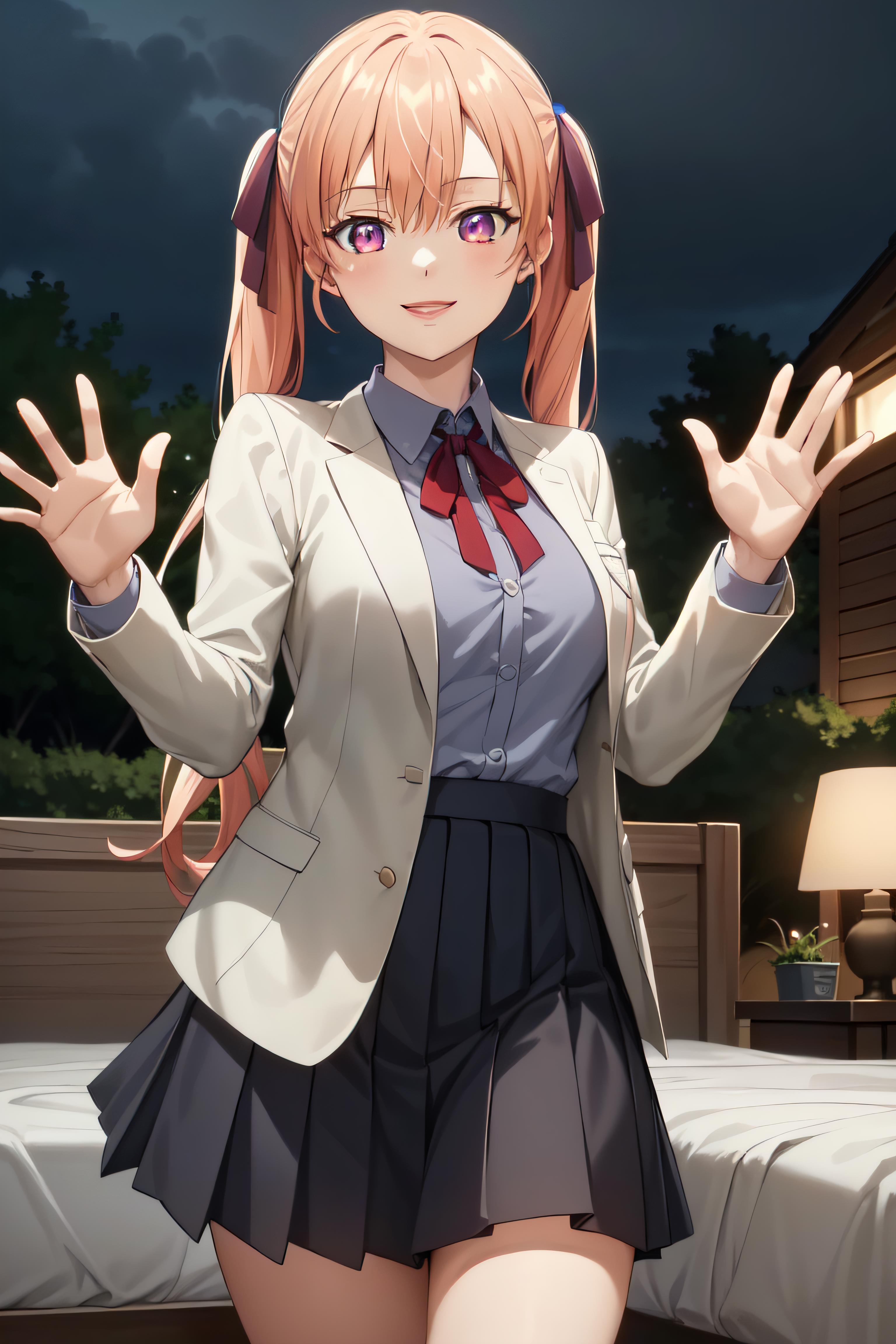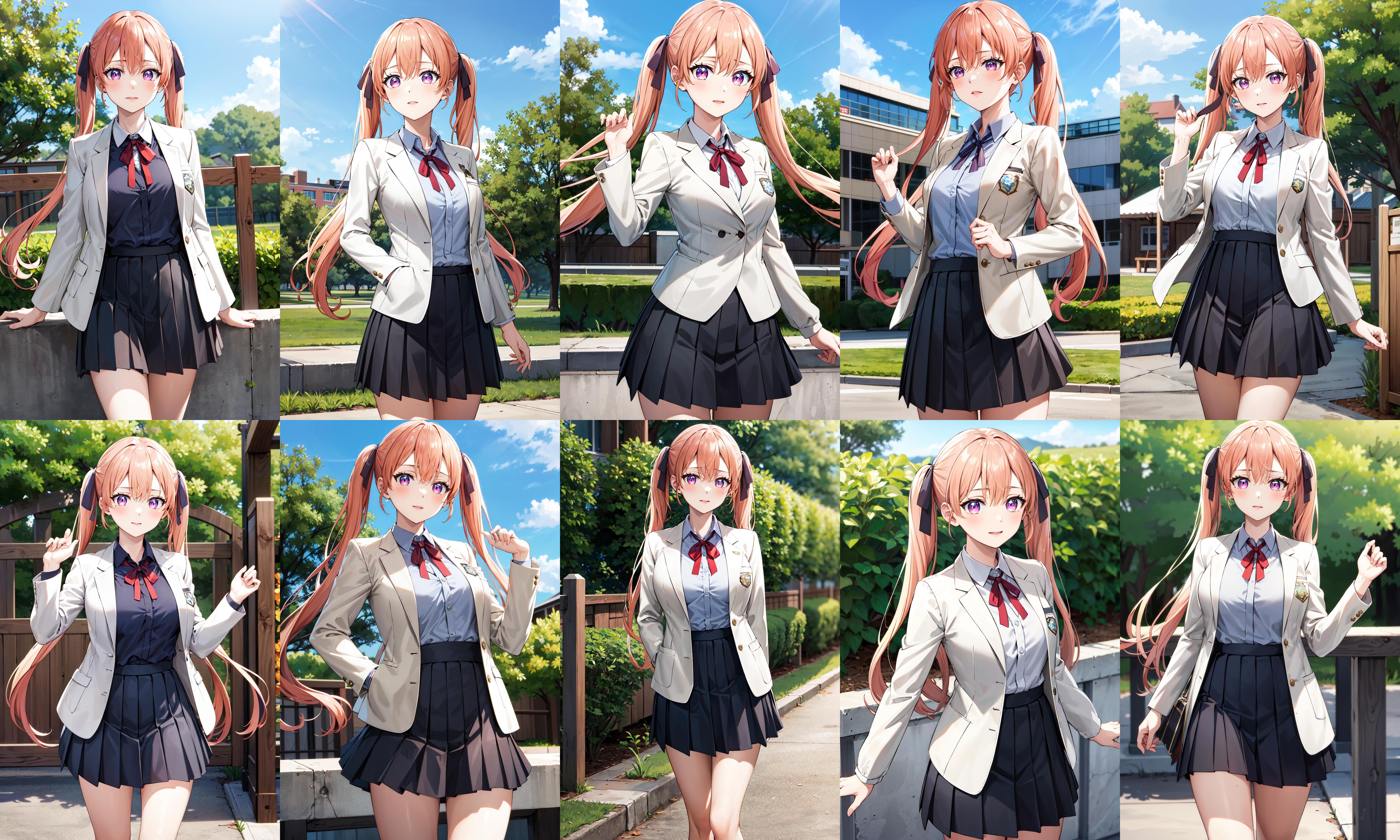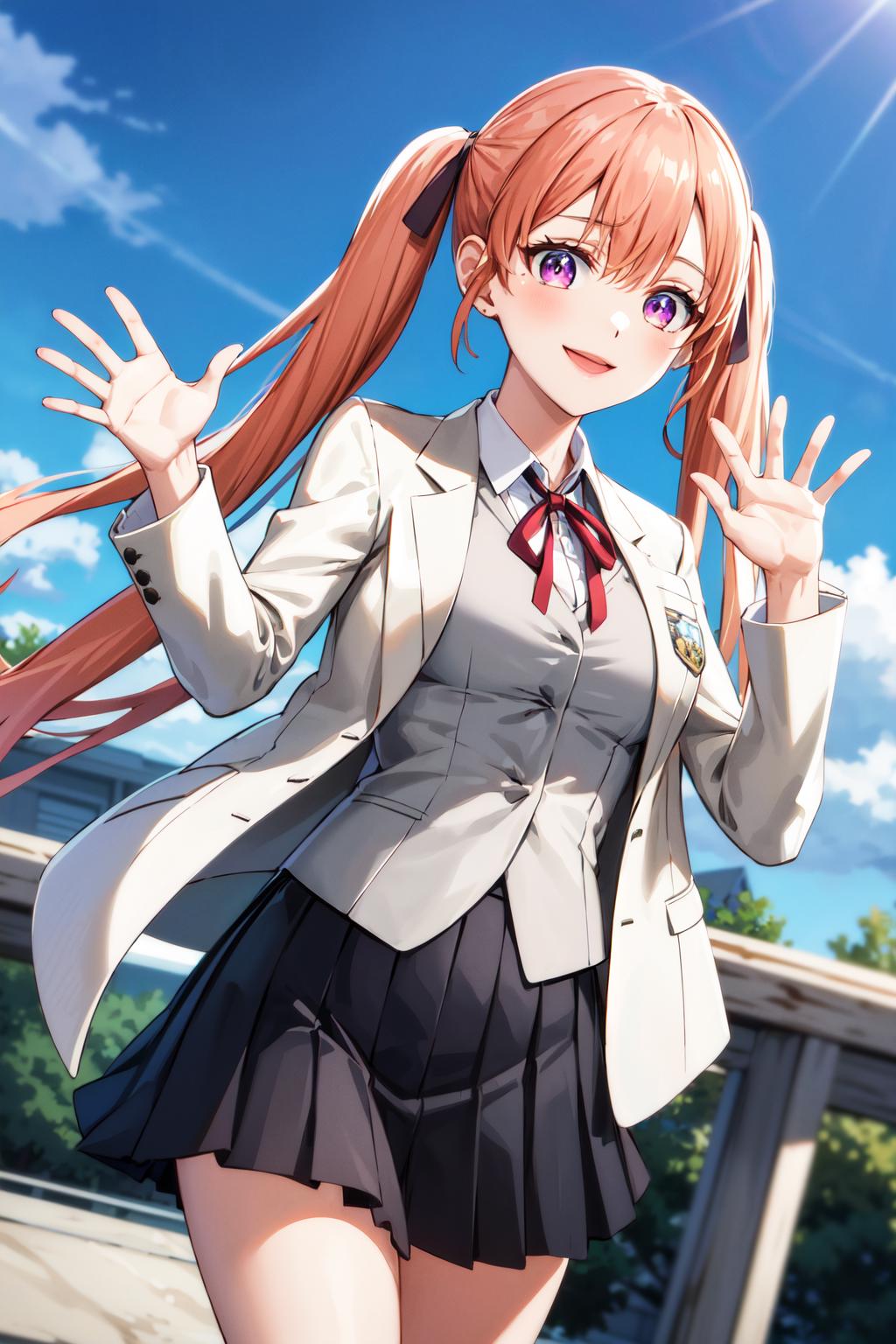 aaerika, long hair, twintails, hair ribbon, school uniform, neck ribbon, collared shirt, white jacket, black skirt, pleated skirt