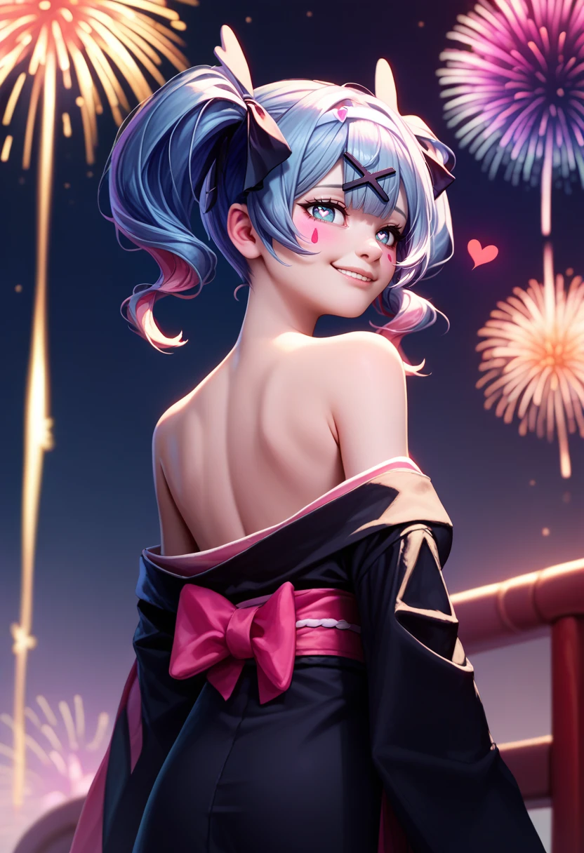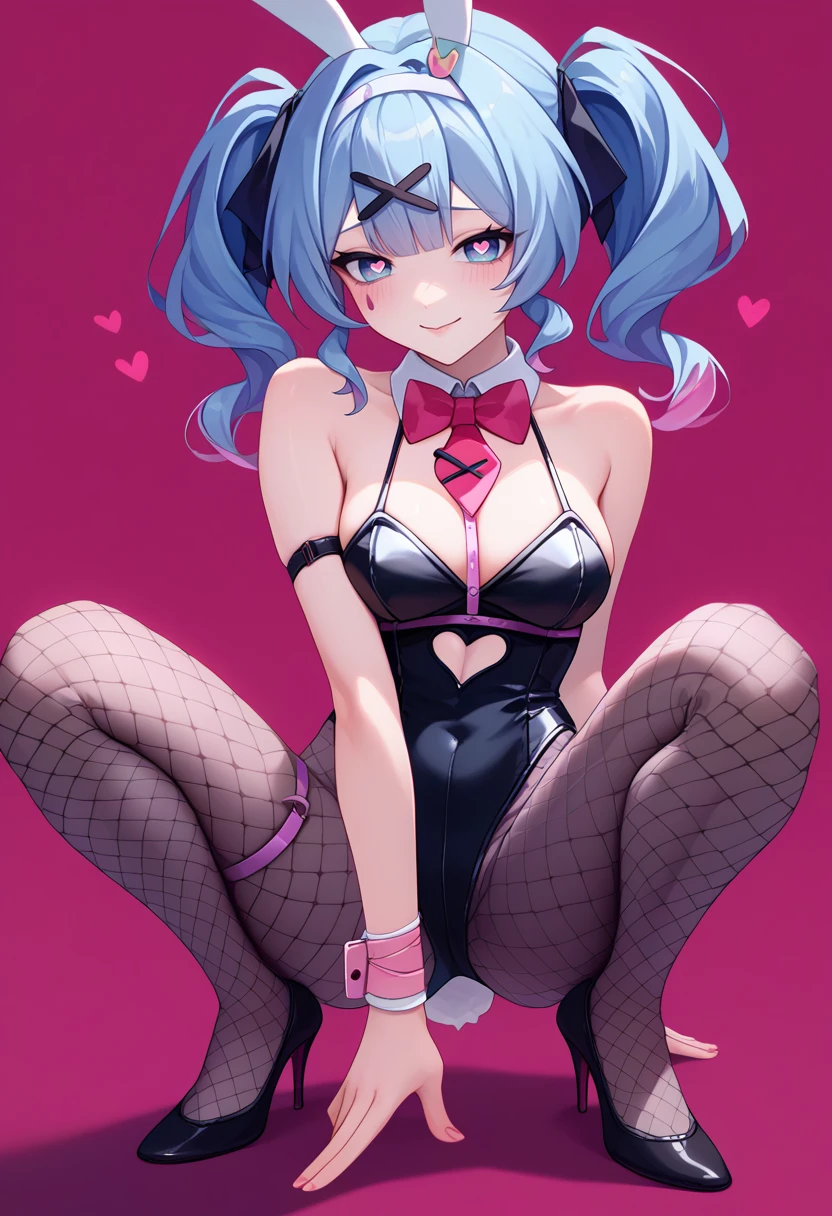 Trigger + Appearance: rabbitholemiku, facial mark, twintails, x hair ornament, hair ribbon, heart-shaped pupils