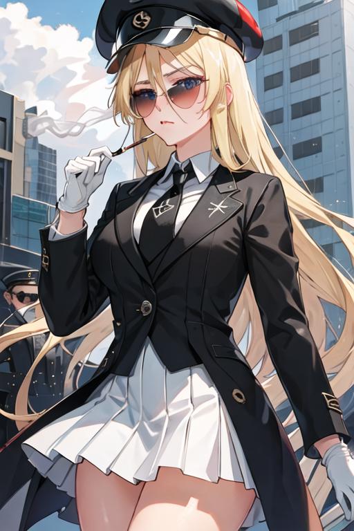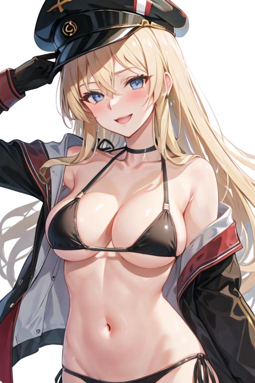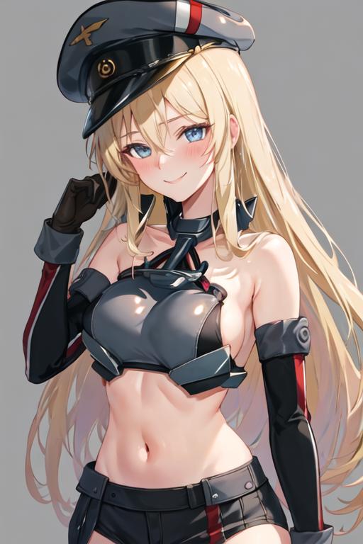 The trigger word is bismarck_azurlane, and the recommended tags are masterpiece, best quality, highres, solo, {bismarck_azurlane:1.10}, blonde_hair, long_hair, blue_eyes, ???????, large_breasts, hat, peaked_cap, military, blush, hair_between_eyes.