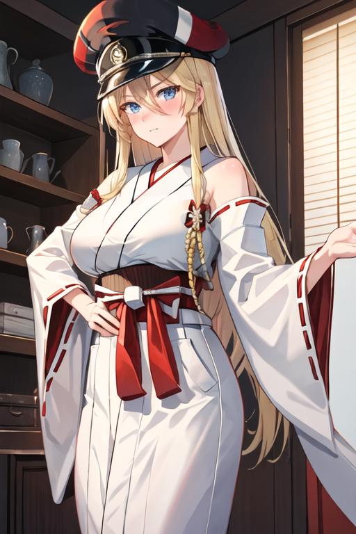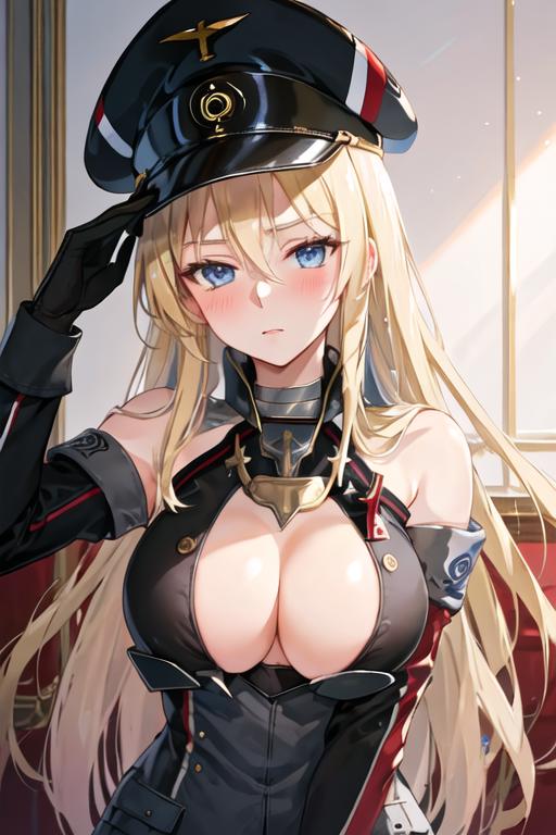 blonde_hair, long_hair, blue_eyes, breasts, large_breasts, hat, peaked_cap, hair_between_eyes, blush, military