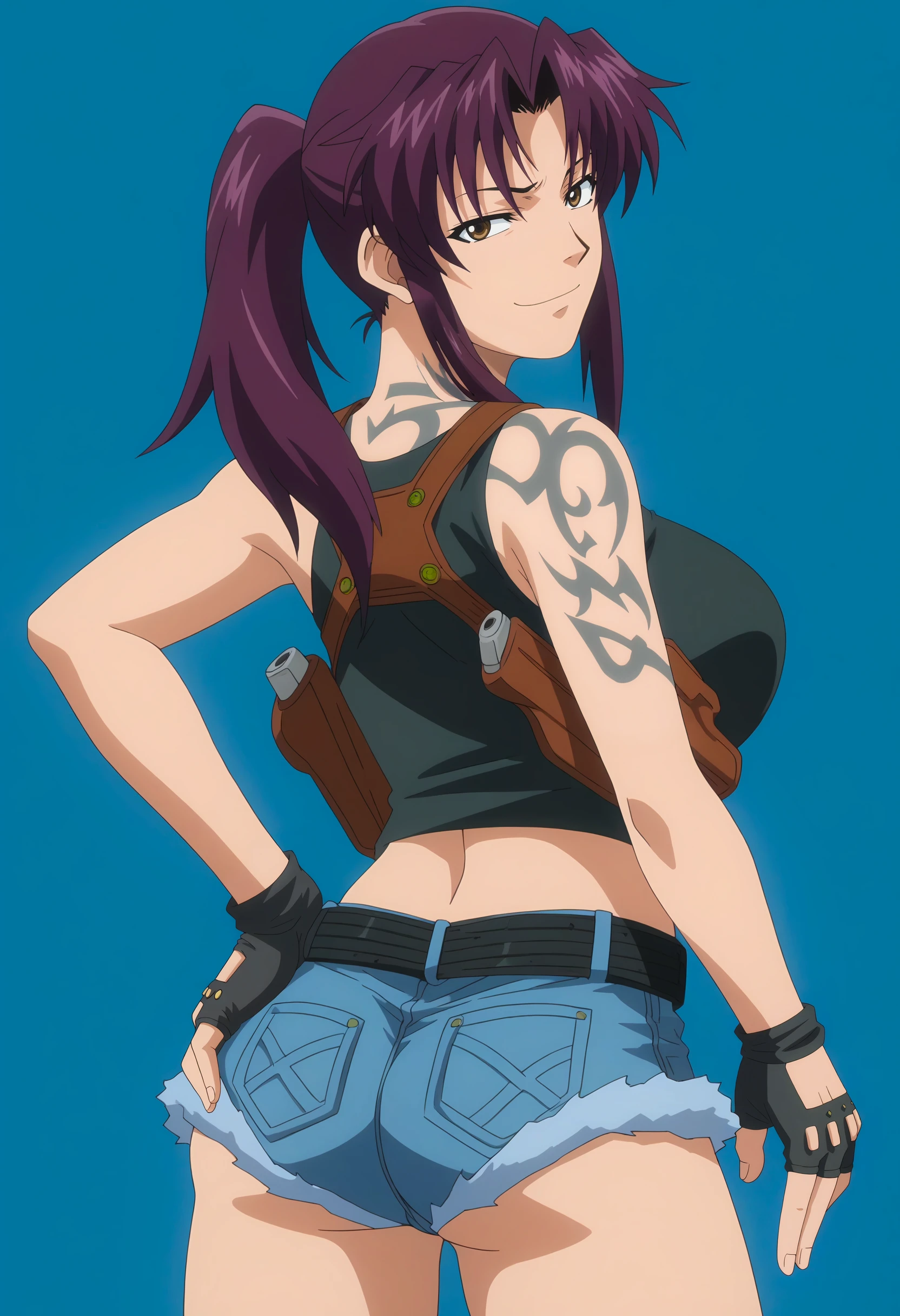 revy, purple hair, brown eyes, shoulder tattoo,