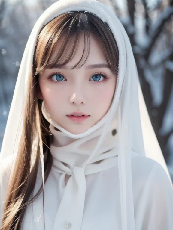 [a white lighting translucent phantom made of snow], dark muted tones, The white, A world covered in snow, branches covered with snow, cold winter touch, Unparalleled beauty, Lustrous firm and shiny skin, Bangs between the eyes, Glossy straight beautiful pale blonde, Perfect body, Super Long Straight Silky blonde Hair, eye line, ???? beautiful innocent 18 years old, High definition big beautiful bright pale brown eyes, Beautiful and nice girl,  cute winter dress, emerald color accessaries, detailed decoration, Glossy face, Small face beauty, cowboy body shot,