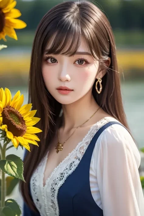 ( Absurdly , High Quality , ultra detail ) ,( Handmade ) , One Girl , Alone, mature, touch very long hair , Sunflower Hair , The beautiful crystal eye in the upper left corner ( Eye details ) Baroque, necklace, long dress , Long Sleeve , elegant , colorful , Best Details , upper body , Along with the river and sunflower flowers