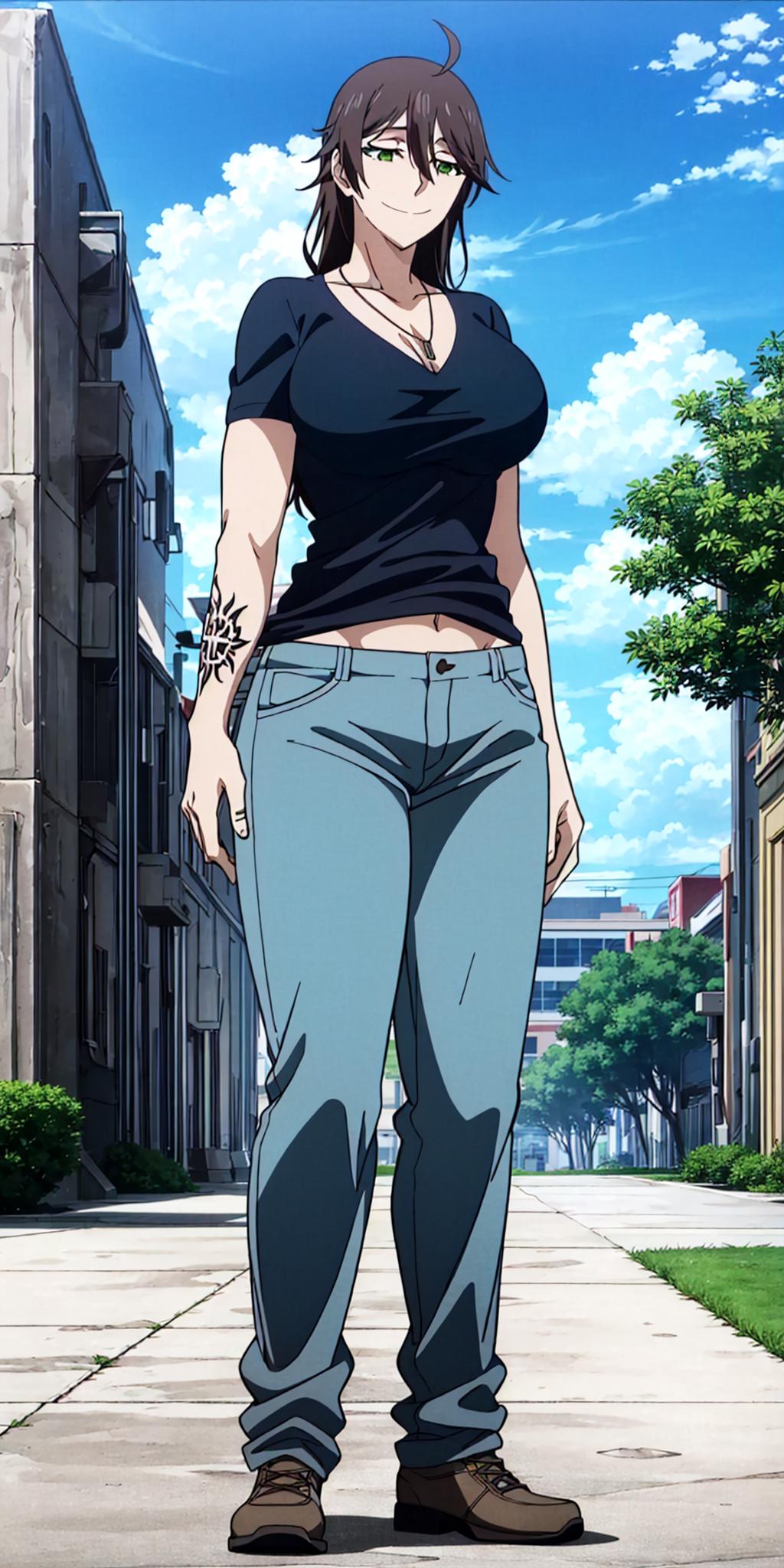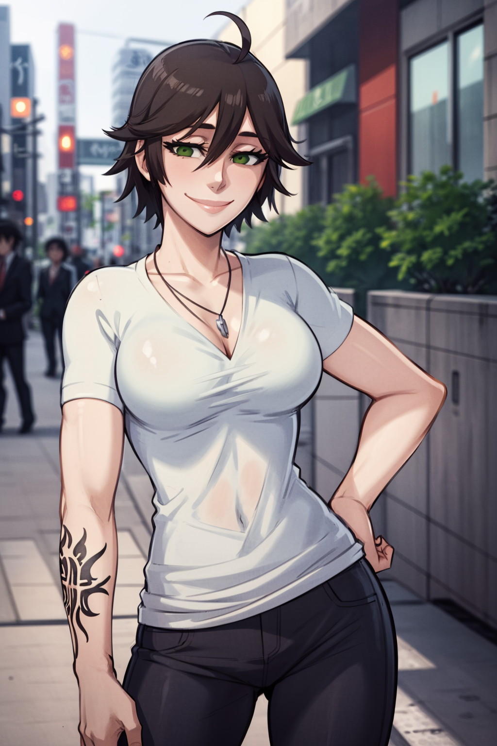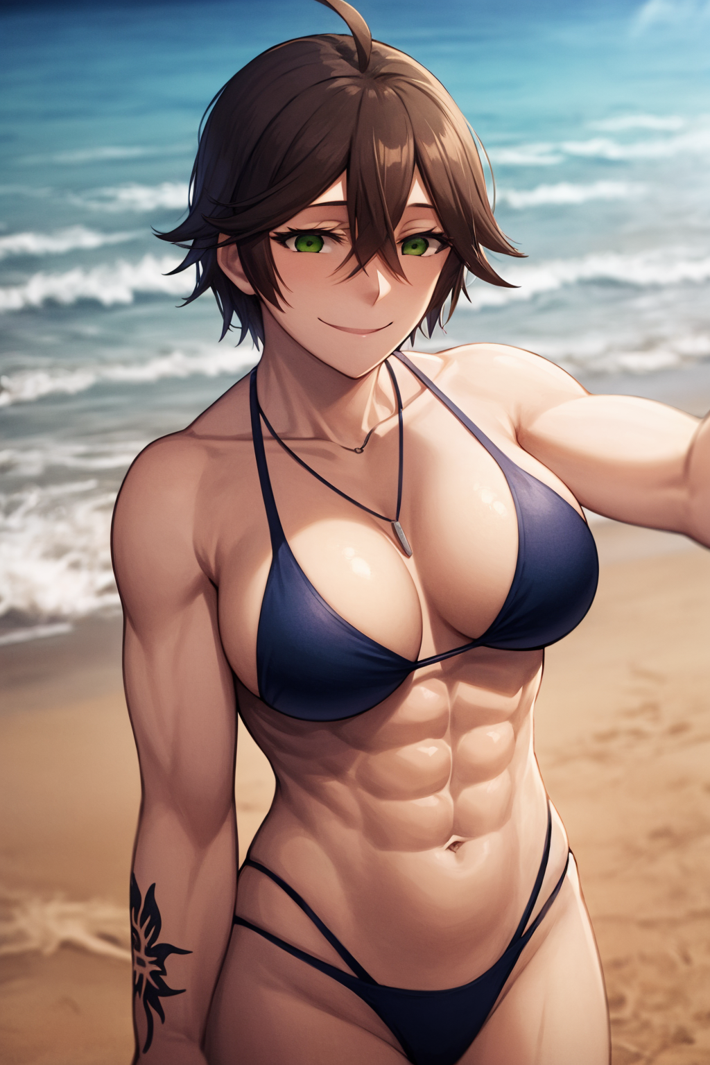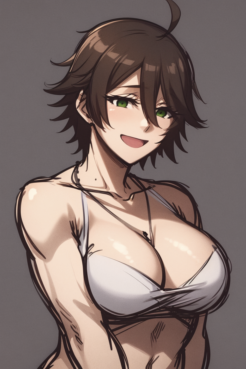 Other prompts : smile, short hair, brown hair, ahoge, green eyes, ???????, tattoo, shirt, hair between eyes, necklace, pants, navel