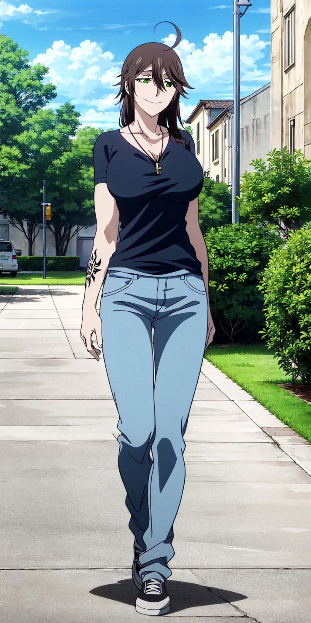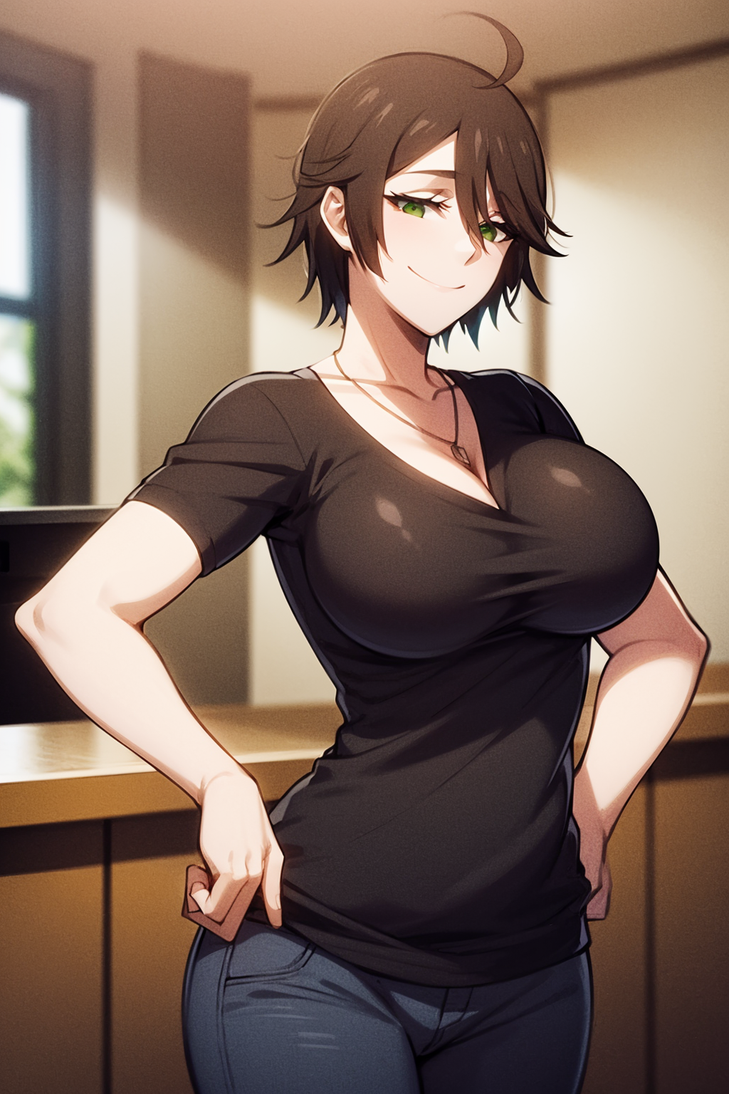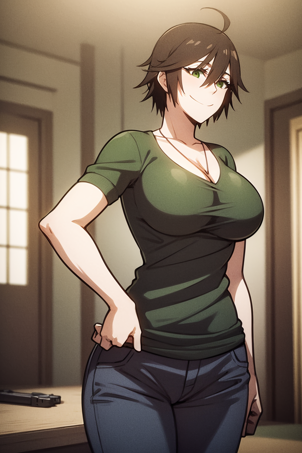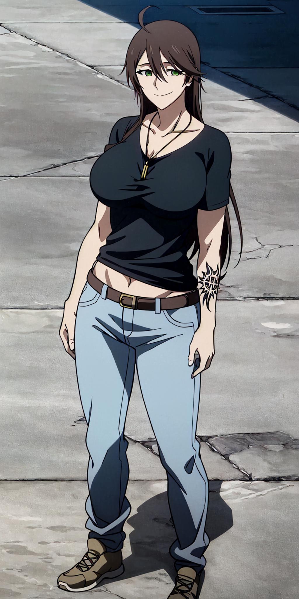Other prompts : smile, short hair, brown hair, ahoge, green eyes, ???????, tattoo, shirt, hair between eyes, necklace, pants, navel