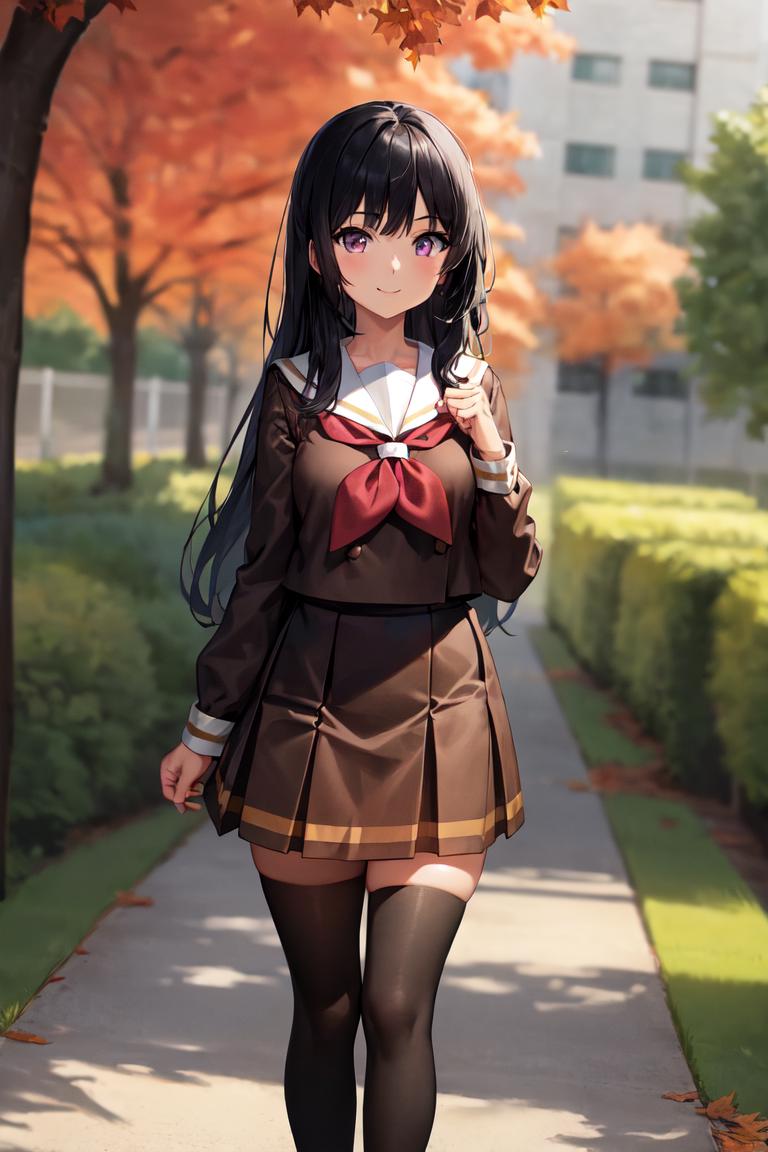 "KousakaWinter, long hair, school uniform, brown skirt, brown shirt, long sleeves, black thighhighs, sailor collar, red neckerchief"