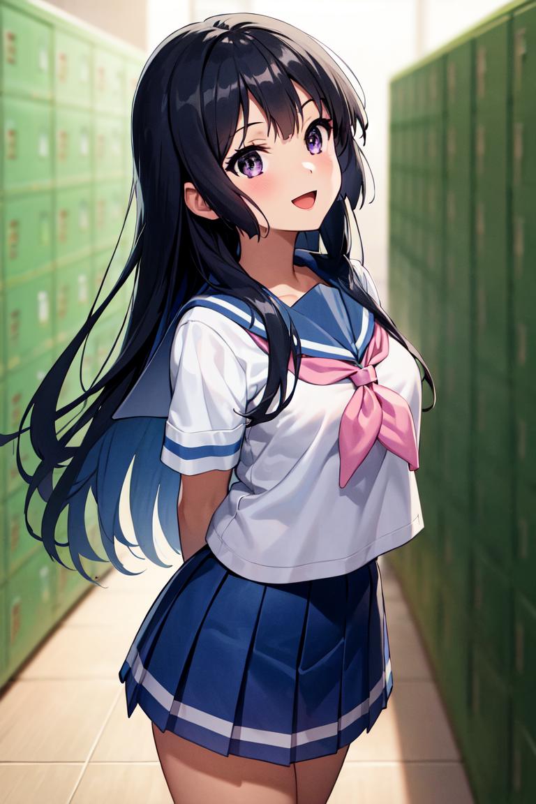 "KousakaSummer, long hair, white serafuku, short sleeves, pink neckerchief, blue skirt, black socks, kneehighs, loafers"